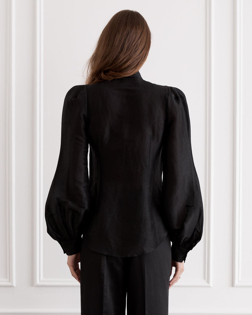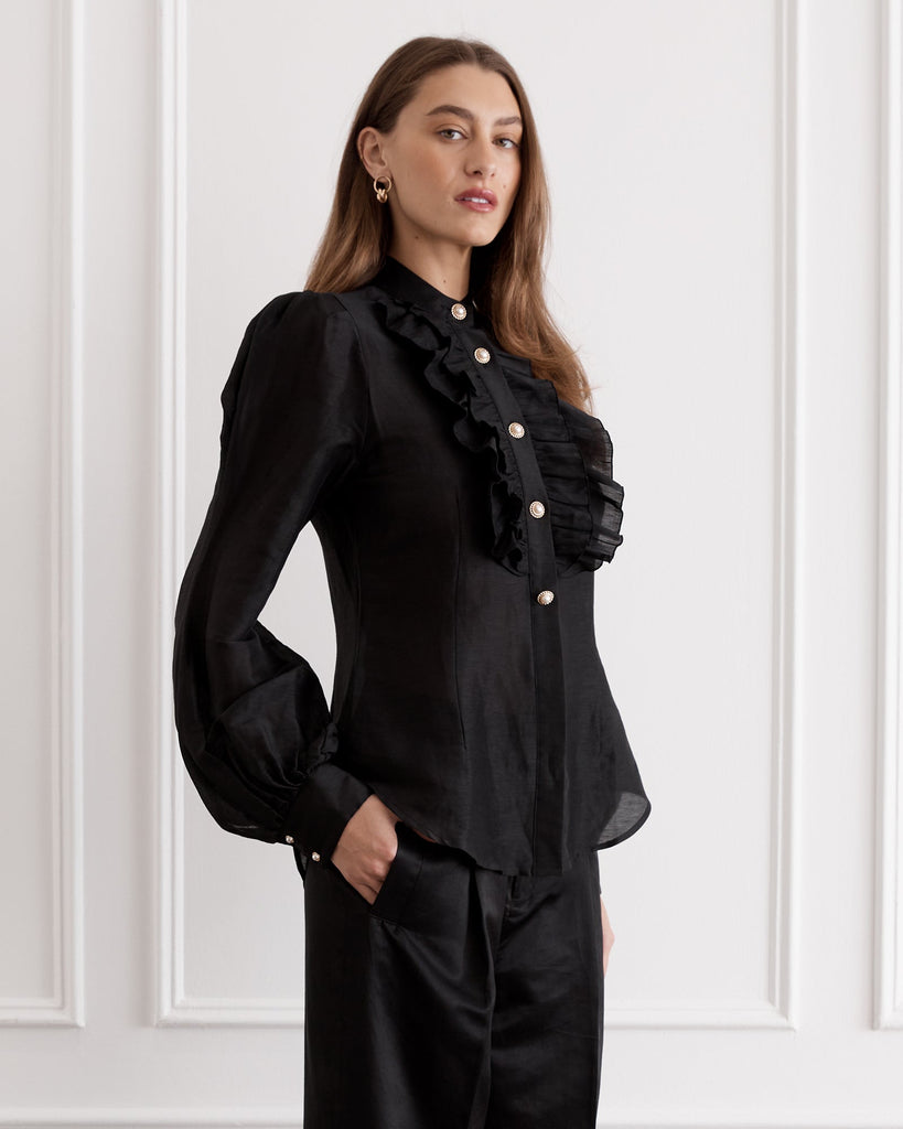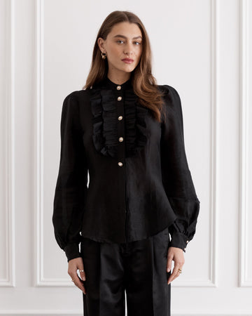 The Anastasia Blouse is a symphony of glamour and sophistication. Woven from the strength of French Linen and the decadent fluidity of Mulberry Silk, allowing it to hold both structure and softness. Artful blouson sleeves meet a structured cuff, finding a perfect balance of detail and form.
