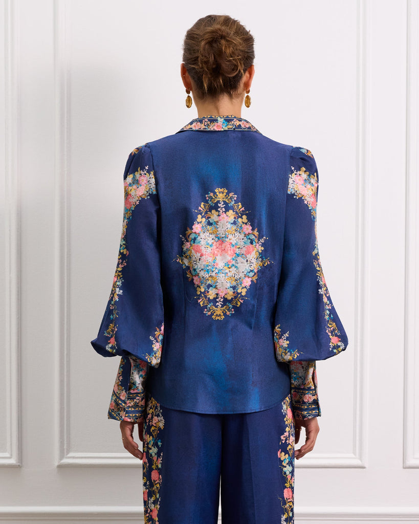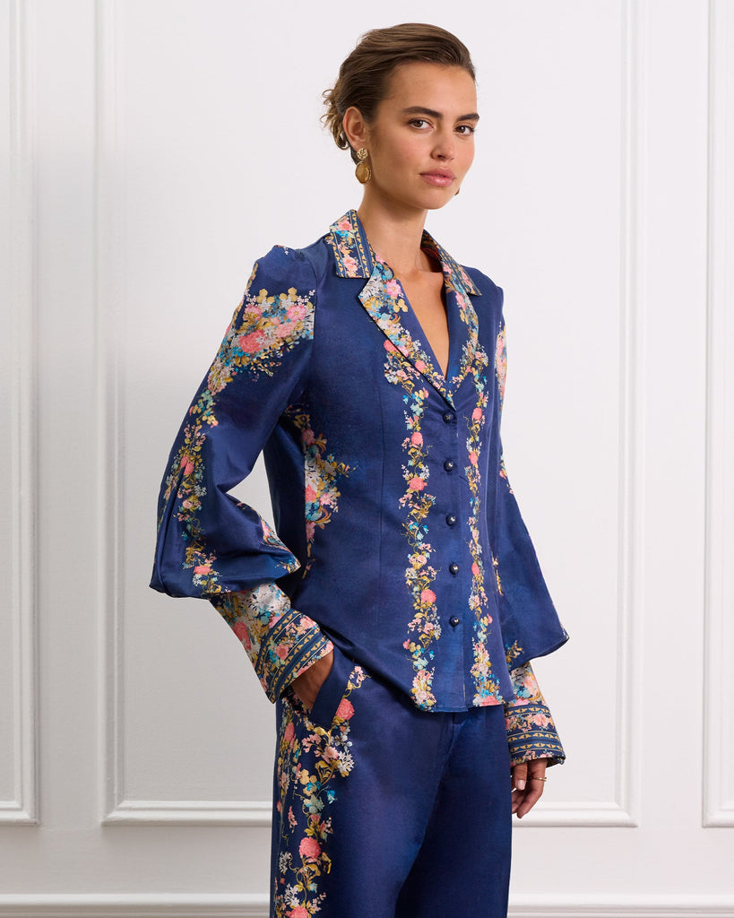 The Rylie Blouse is a symphony of the casual charm of denim, blended with baroque-inspired florals. Woven from the softness of Mulberry Silk and the breathability and strength of Bamboo Cotton, while an intricately embroidered filigree trims the cuffs, paying homage to the climbing vines that grace the storied walls of French châteaux.