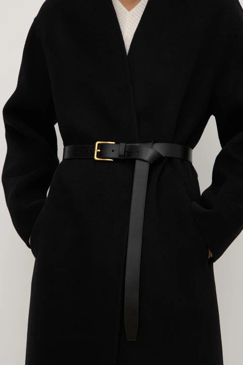 Extra long womens leather belt featuring brushed gold hardware and nine notches for added adjustability. Can be styled on the waist or hip.