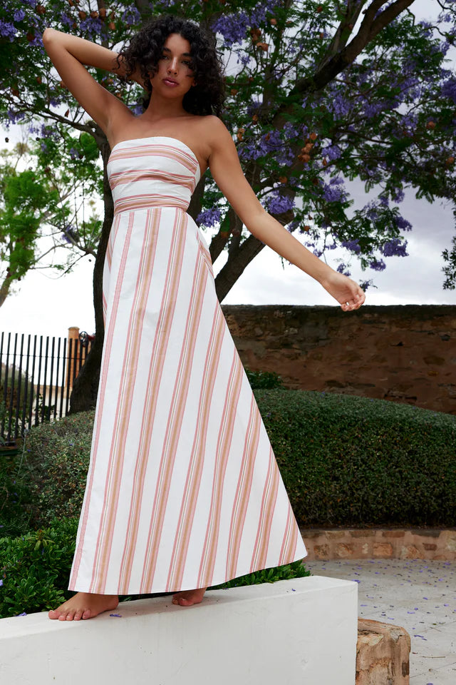 This breezy strapless maxi dress is the epitome of effortless elegance. Featuring a flattering fitted bodice that cinches at the waist, it flows into a voluminous, sweeping skirt that moves beautifully with every step. The soft striped pattern in warm neutral tones adds a timeless charm, making it perfect for sun-drenched days and balmy evenings. Pair it with delicate sandals for a laid-back yet sophisticated look.