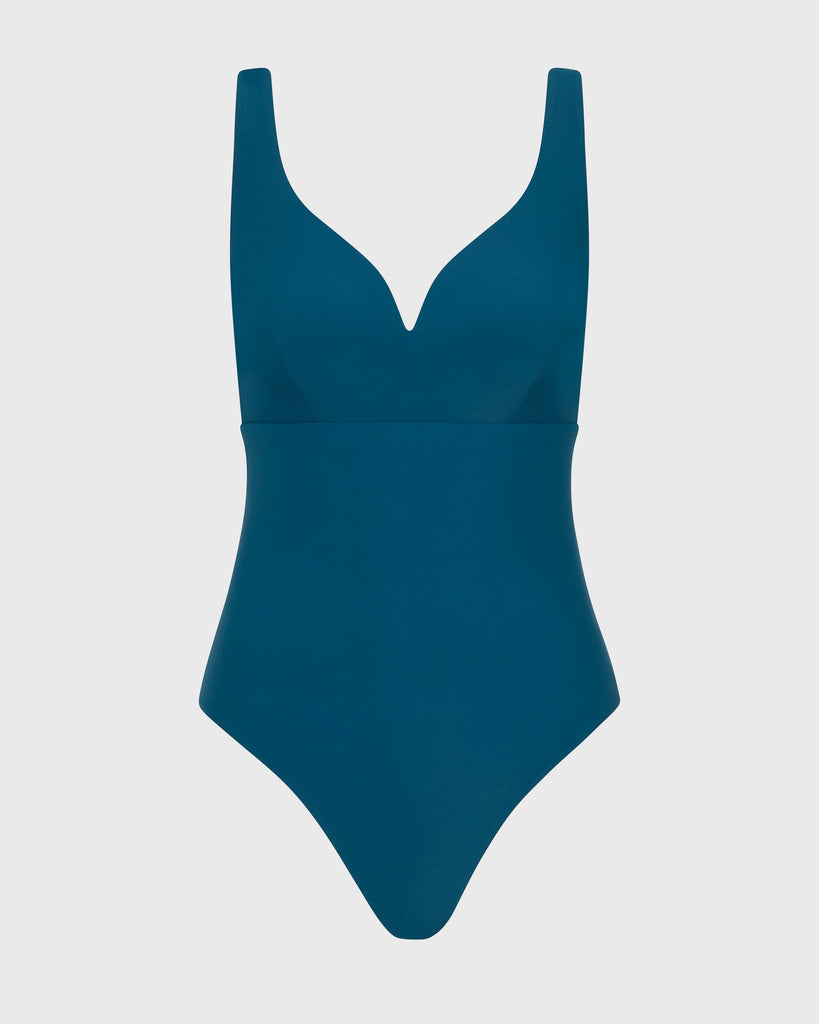 Bold yet elegant, the Vera One Piece in striking Tropico blue features a plunging sweetheart neckline, a low scooped back, and a regular leg line. A centre-front V-wire highlights the décolletage, while invisible under-bust support, wide, soft shoulder straps and removable cups ensure flattering and comfortable bust support.  Vera is cut from our luxury Sculpteur® fabric, sustainably produced in Italy, that employs a patented 3-D stretch technology to refine and smooth the silhouette. Vera is ideal for larger busts from sizes D to F.  Sculpteur® is designed to fit firm, size up if between sizes