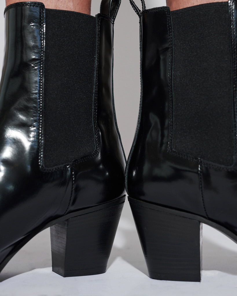 The Giorgia boot is our modern ankle silhouette. Handcrafted from luxurious Abbresavato leather. Featuring an elasticated side panel, squared off toes, and block heel, Giorgia is comfortable for all day wear. Wear yours with vintage denim, billowing skirts, or tailoring for a sleek finish.