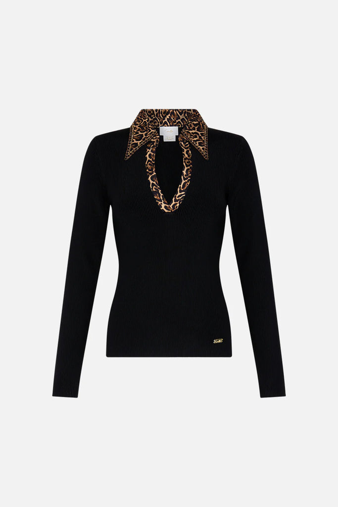 The Amsterglam Fitted Knit Top With Silk Collar delves into a midnight black dream laced with lavish leopard highlights. This luxury ribbed knit top features a fitted silhouette throughout the body and the full length sleeves. With the addition of a contrast silk collar and placket this knit top exudes everyday opulence. Explore more from the Wonderkind collection.