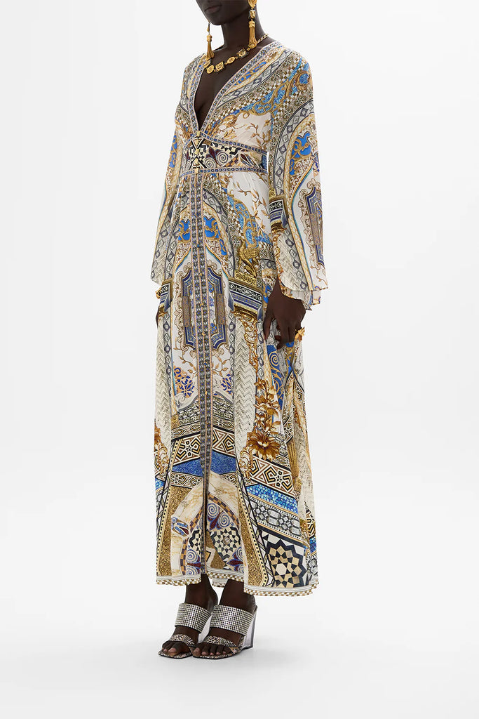 Designed in Australia, The Make Me Your Mosaic Kimono Sleeve Dress With Shirring Detail evokes the breathtaking tessellations that adorn the sacred walls of Egypt's architectural masterpieces Lovingly handcrafted, this silk maxi dress features a slightly blousy bodice that cinches into a shaped adjustable waistband. The softly gathered flowy skirt falls to maxi length while statement flared sleeves dance at the wrists.