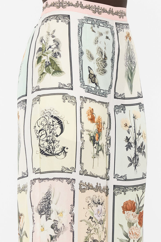 The Long Live Letterpress Minimal Wide Leg Pant delves into postcard moments of intricate illustrative florals. This luxury silk pant showcases a sleek waistband detail with and adjustable elastic encased back, flowing into a soft wide leg trouser that dances at ankle length. Explore more from the Wonderkind collection