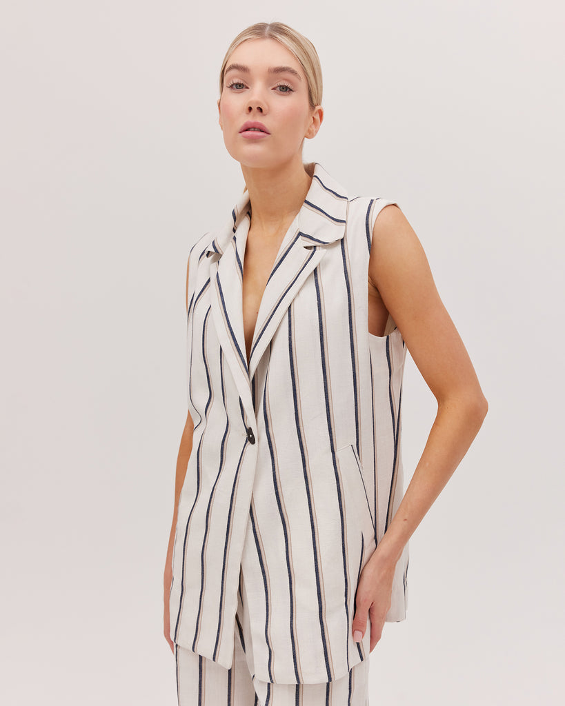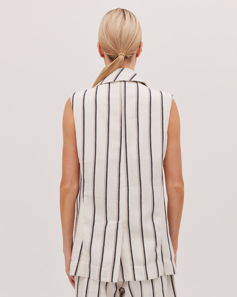 The Tailored Vest, a versatile styling piece designed for transeasonal wear. Crafted in our signature hand loomed khadi cotton, this vest features a statement corozo butto & french seams. Pair with The Tailored Vest for a classic look.