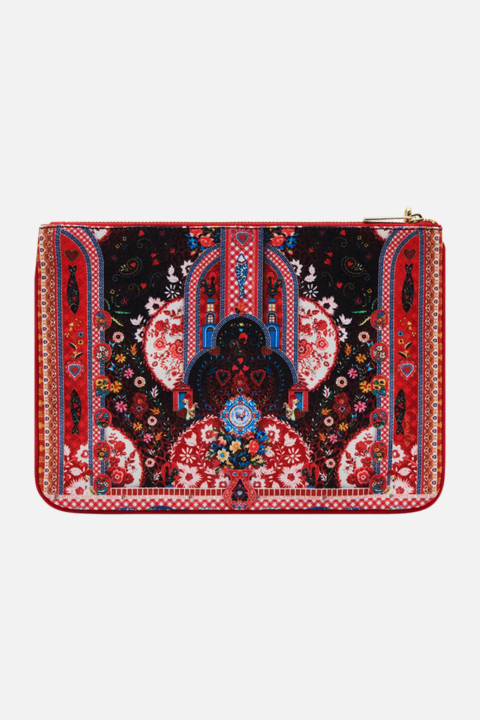 Designed in Australia, The Folk Fabulous Small Canvas Clutch celebrates the colourful Barcelos Cockerel set against archways and folk-inspired blooms, while dark accents and embroidery evoke the charm of Portuguese kitsch and tradition. Lovingly handcrafted, this CAMILLA clutch bag showcases a streamlined rectangle silhouette adorned with contrast piped edges, a zip top enclosure, and finished with a custom made parrot clip. The internal pocket and generous main compartment keep your treasures stored in style.