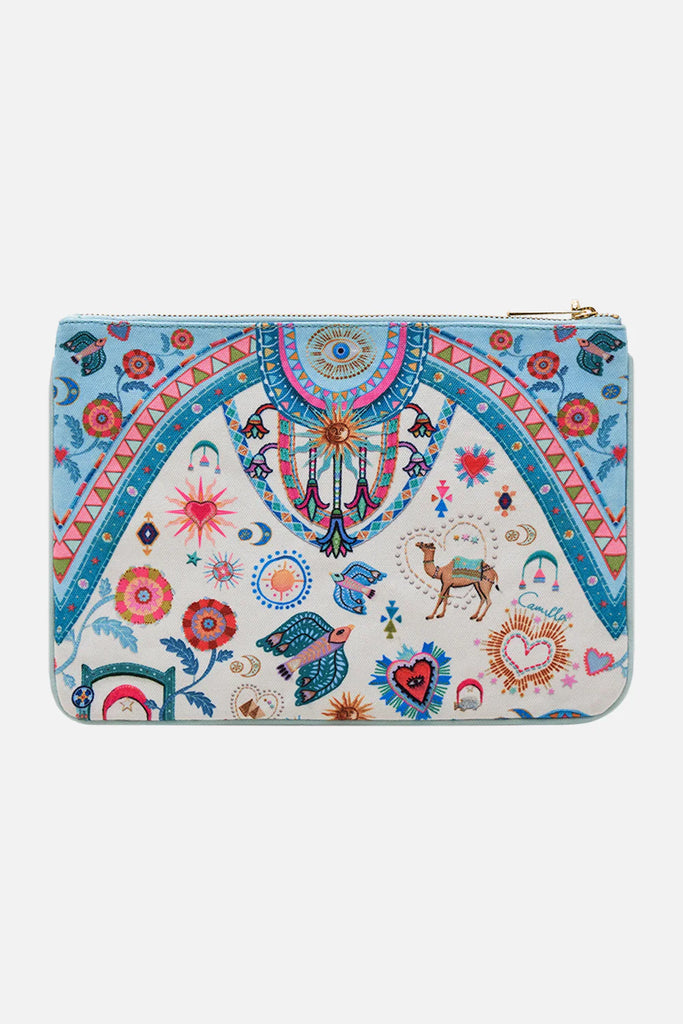 Designed in Australia, The Living In Colour Small Canvas Clutch greets you into a cacophony of cheerful chaos, featuring hand painted suns, hearts, crescent moons, and palm fronds, embroidery motifs resting delicately on an ivory canvas. Lovingly handcrafted, this CAMILLA clutch bag showcases a streamlined rectangle silhouette adorned with contrast piped edges, a zip top enclosure, and finished with a custom made parrot clip. The internal pocket and generous main compartment keep your treasures stored in style.