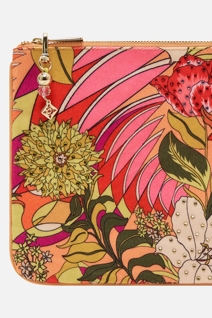 The Flower Child Society Small Canvas Clutch depicts a 70's inspired scene of vibrant orange imbued with statement retro florals. Featuring a beautifully bespoke print, this luxury clutch bag showcases a streamlined rectangle silhouette adorned with contrast piped edges, a zip top enclosure, finished with a custom CAMILLA parrot clip. The internal pocket and generous main compartment keep your treasures stored in style. Explore more from the Wonderkind collection.