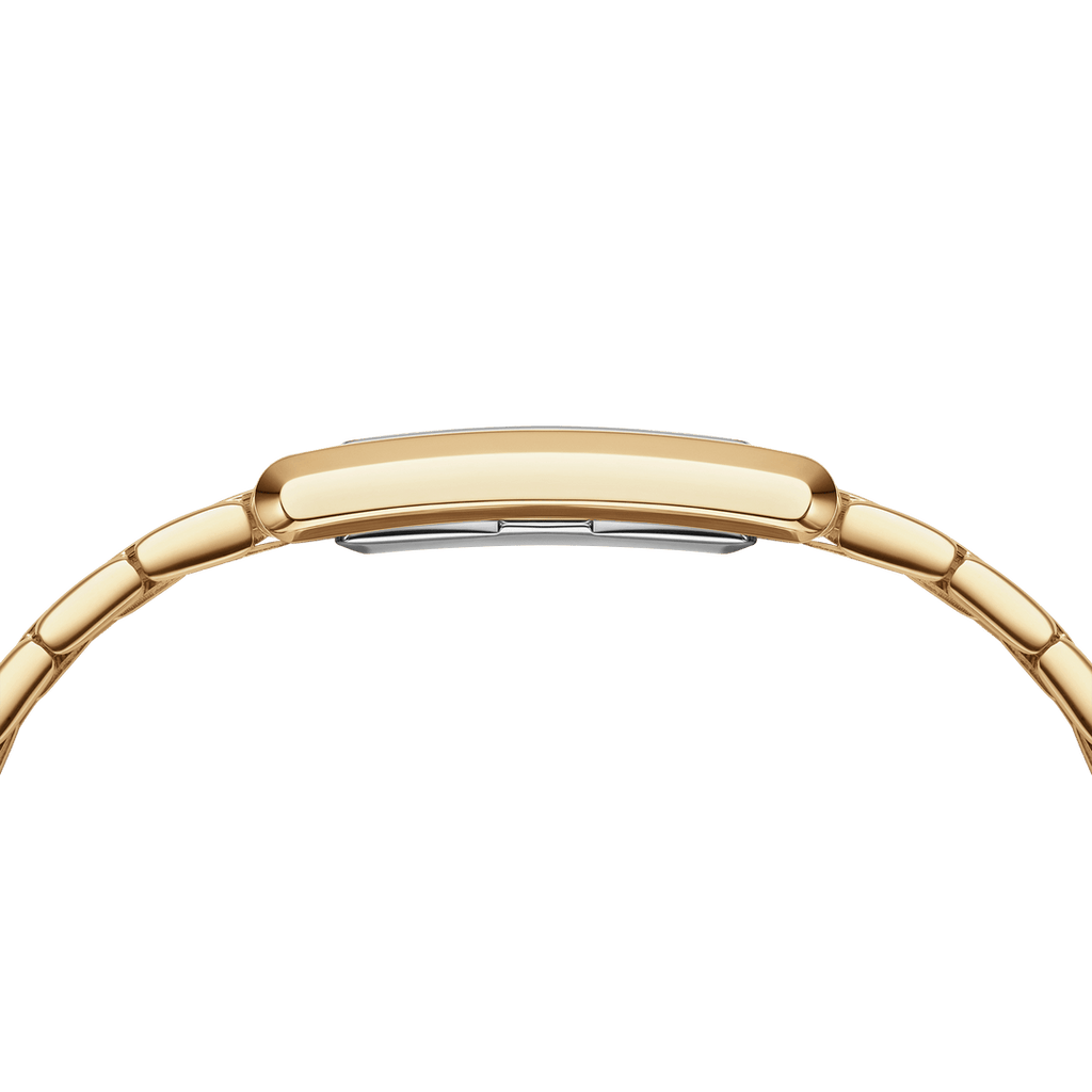 With sleek geometric edges and two sizes to choose from, our Bound collection brings perfect symmetry to your wrist. The curved rectangular case of this gold watch matches the exact width of its 9-link strap—giving you a seamlessly integrated dial.