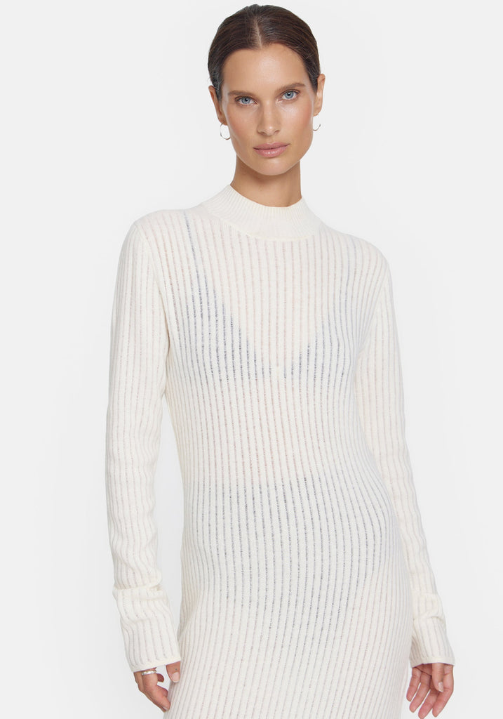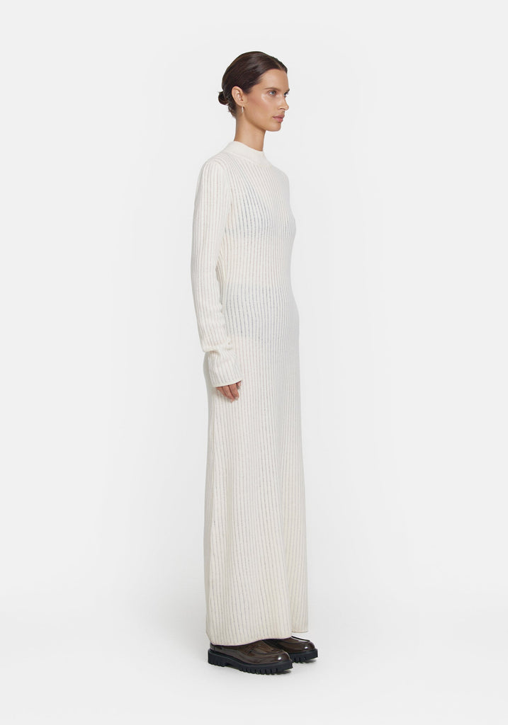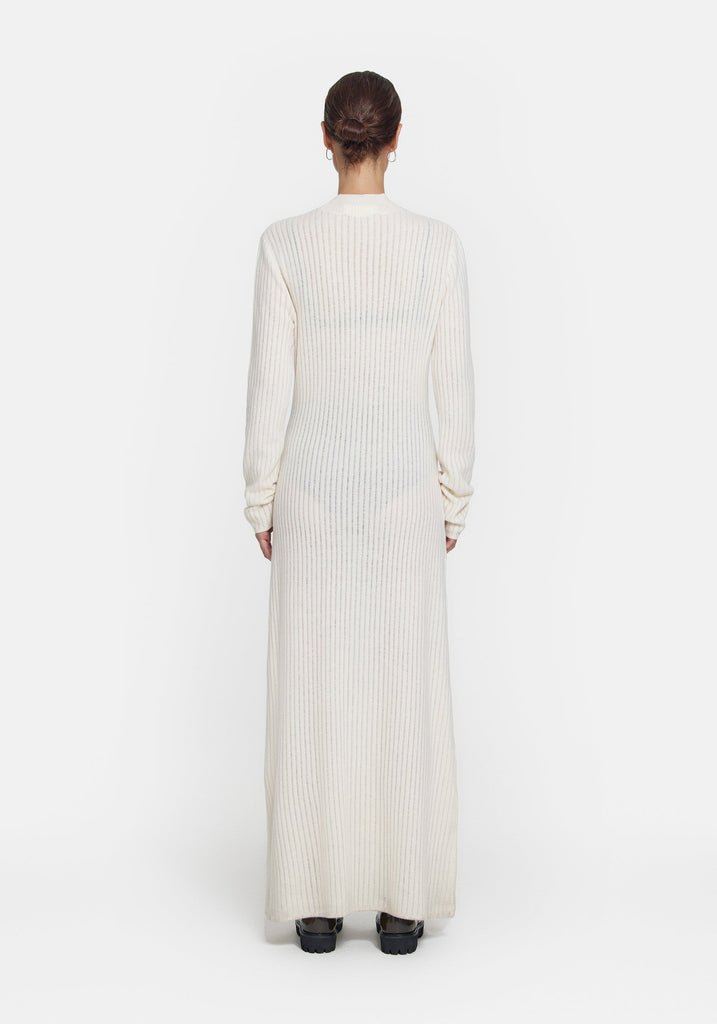 Crafted from ivory merino wool, the Truthful Dress features a fully fashioned knit construction with a dropped stitch design, providing a lightweight and cosy feel. Falling just above the ankle and offering a relaxed fit through the body, it seamlessly blends elevated style with comfort. Complete the ensemble with a blazer and boots for a sophisticated look.