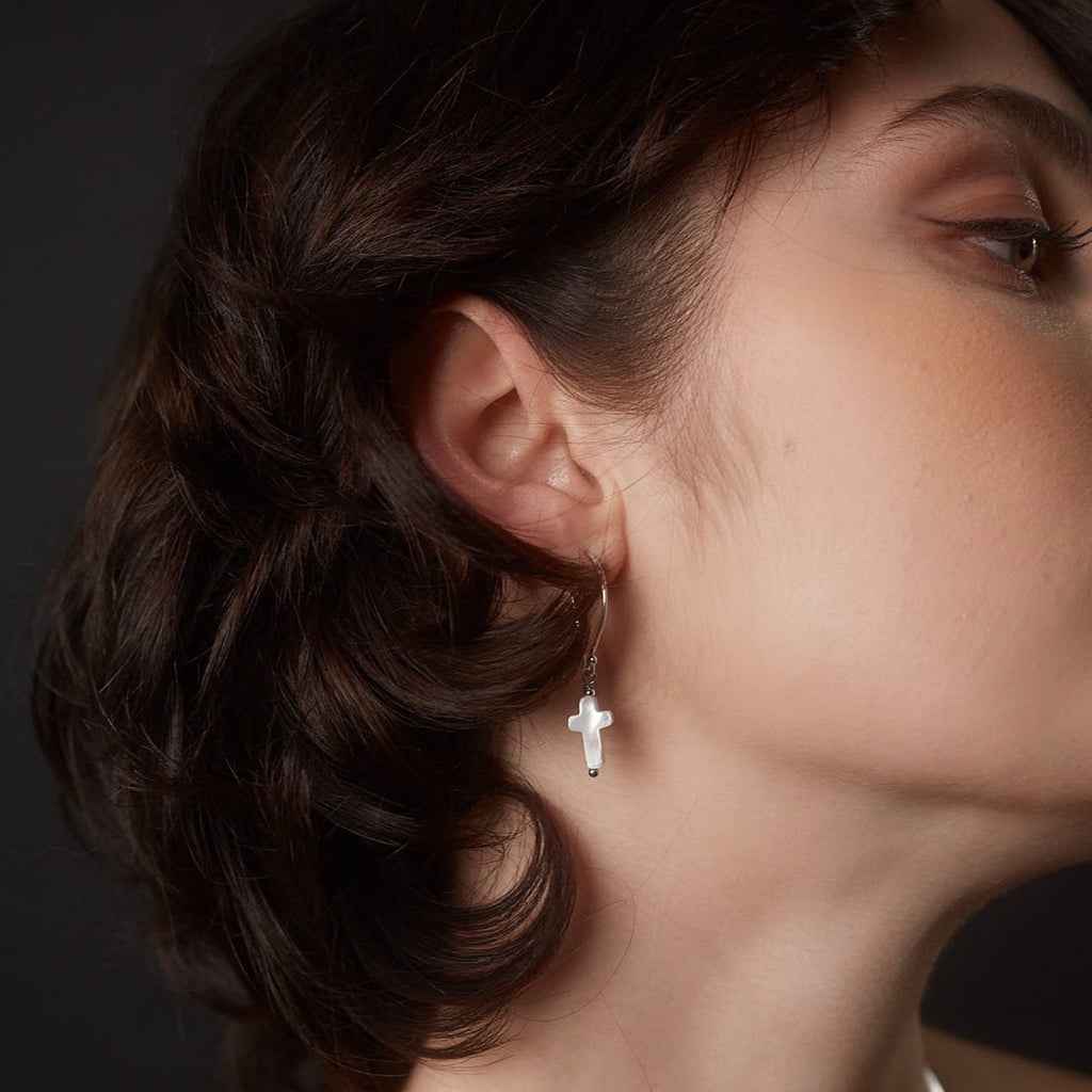 Make a fine statement with these Silk & Steel Honesty earrings, featuring dainty handmade mother of pearl crosses, which hang on a gold plated (vermeil) sterling silver hook. Due to the natural nature of mother of pearl, each cross is unique, making them even more special.