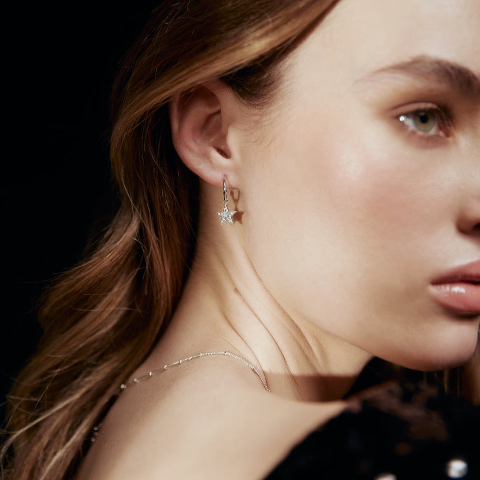Introducing Silk & Steel's Lumiere hoops: where French elegance meets celestial charm. Crafted from rhodium-plated sterling silver, these exquisite hoop earrings feature star pendants adorned with clear cubic zirconias, which capture and reflect the light beautifully.