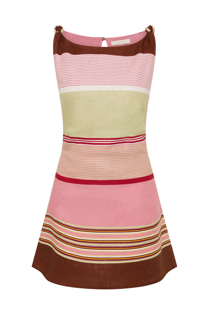 A vacation-inspired maxi dress, designed from a signature 100% European Flax® linen in a warm multi-colour stripe, bringing in tones of mauve, olive and chocolate brown. Sleeveless with a boat-style neckline and knot details at either shoulder, it cinches in at the waist with custom back waist ties before flaring into a soft A-line skirt. With effortless, summer appeal in mind, style with a simple sandal for lunch by the seaside.
