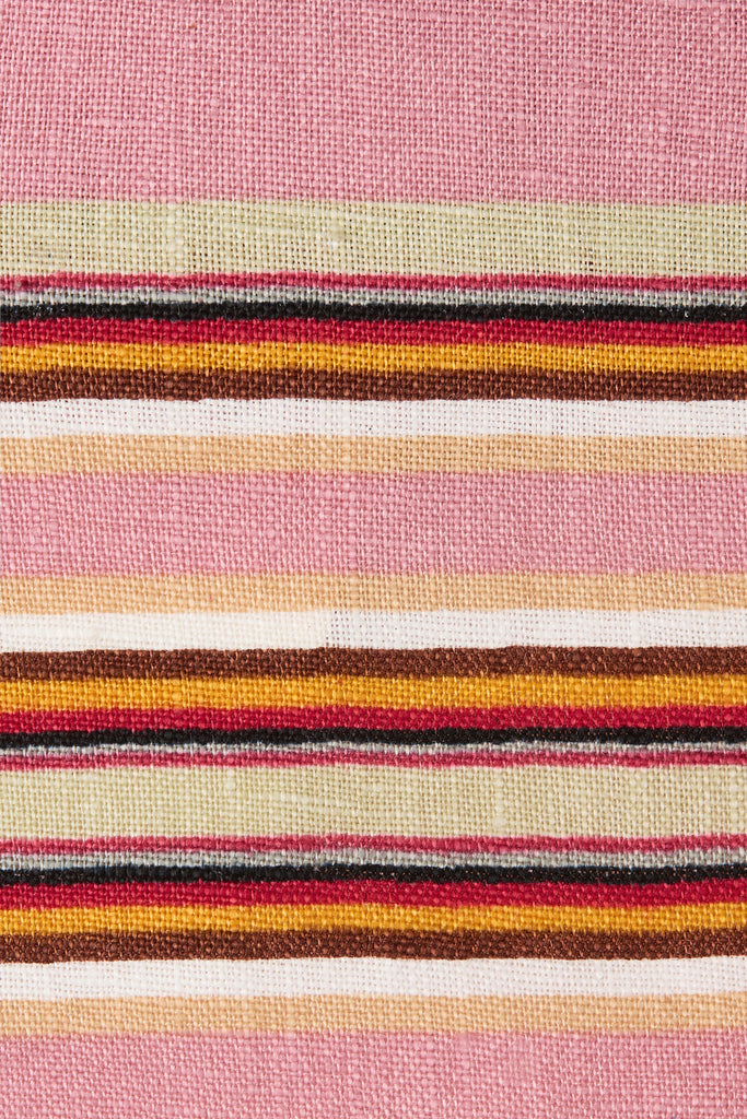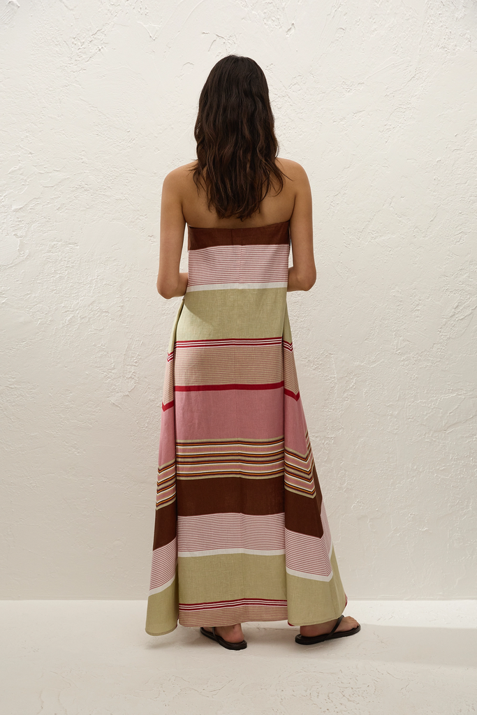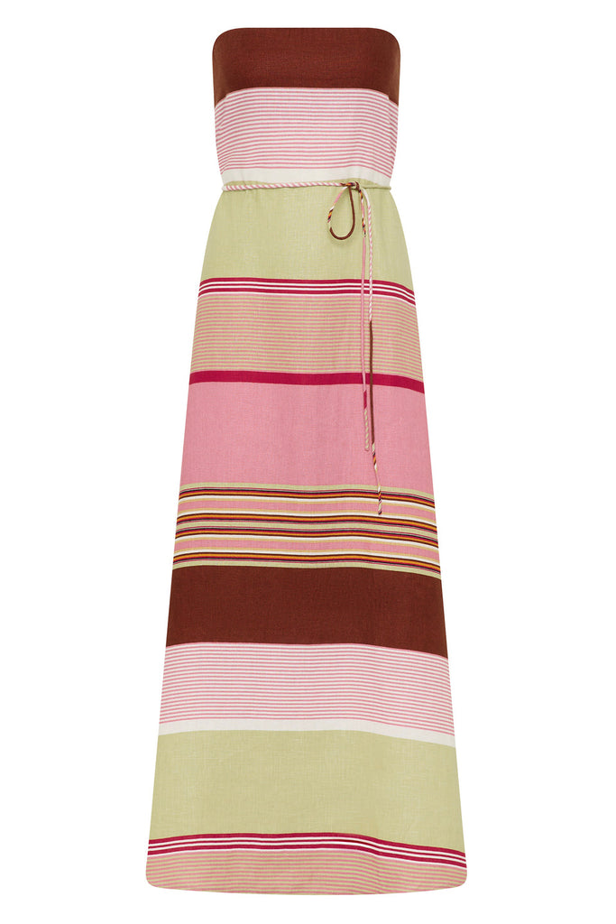 A vacation-inspired maxi dress, designed from a signature 100% European Flax® linen in a warm multi-colour stripe, bringing in tones of mauve, olive and chocolate brown. Strapless with a relaxed A-line silhouette that falls down around the ankles, there is a shirred underbodice for support through the bust. With effortless, summer appeal in mind, style with a simple sandal for day to night dressing. This style is true to size. The shirred underbodice offers some stretch, however is intended to support the bust.