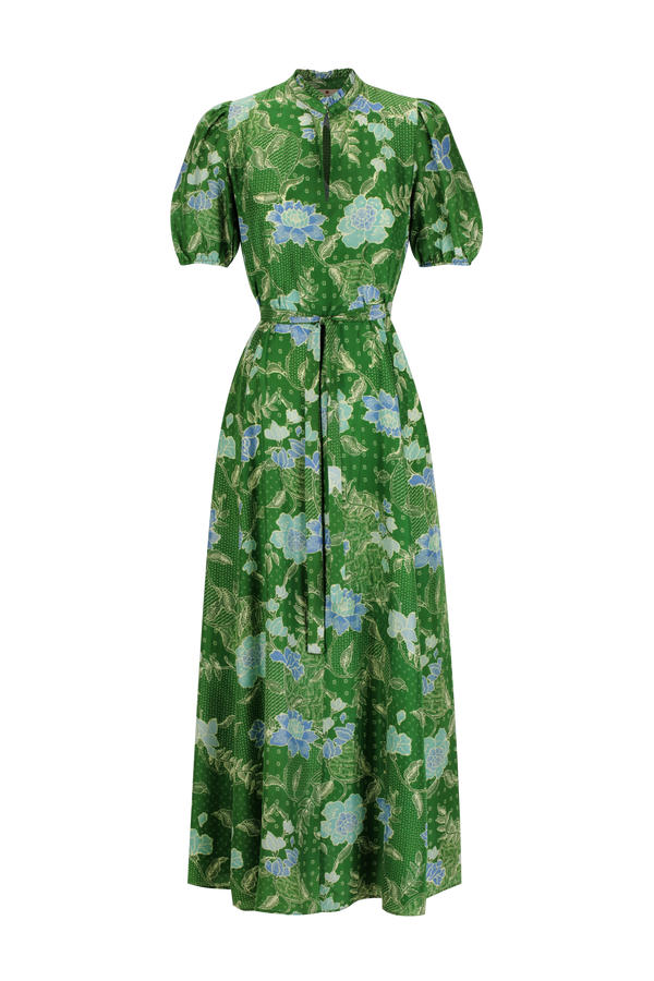 Float from sunlit mornings to evening soirées in our Oceanus Dress, now reimagined in the batik-inspired Bloom Jungle Green floral. Crafted from luxuriously soft silk habotai, this flowing silhouette features a detachable waist tie to shape the fit as you please. Voluminous puff sleeves add drama, perfectly complemented by a stack of gold bangles or paired with simple slides for effortless vacation elegance.
