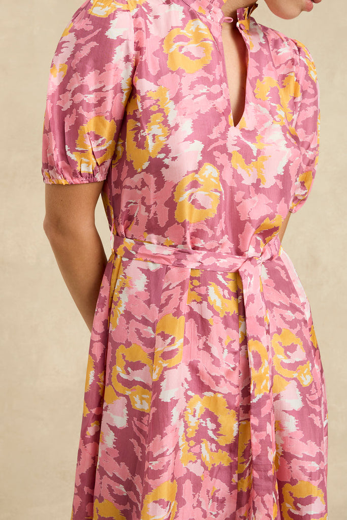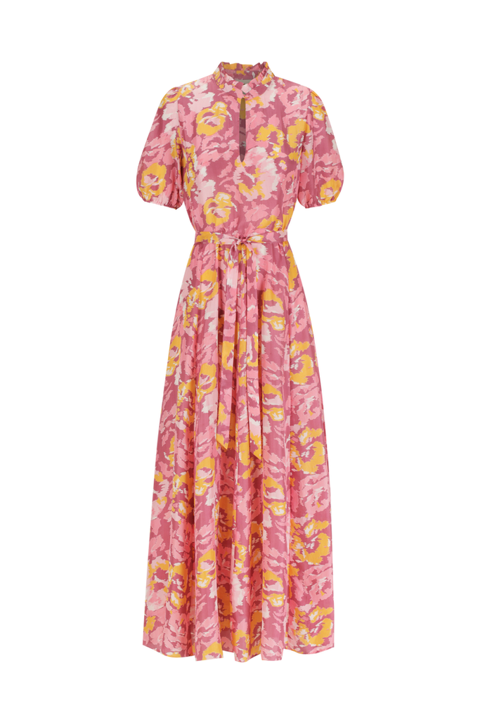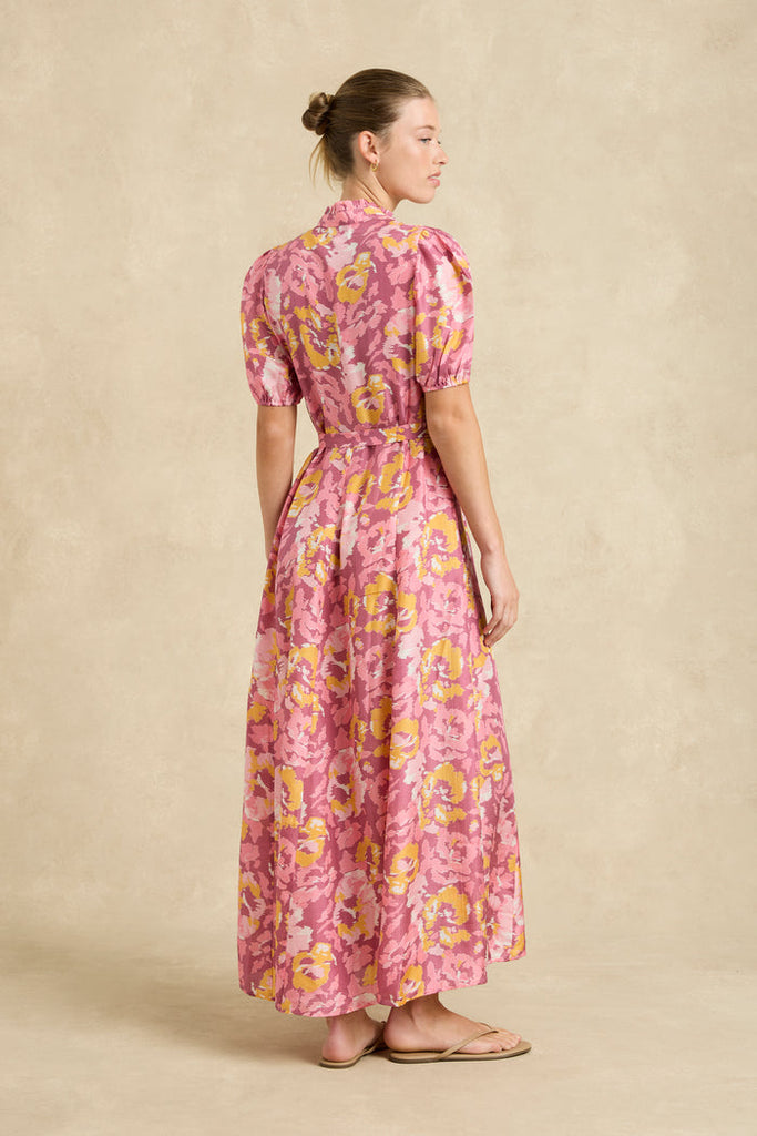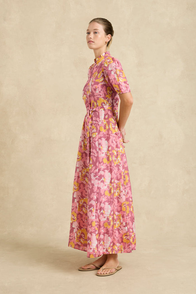 The Oceanus Dress is a soft statement piece, crafted in our Haze Musk print, a painterly blend of rose pink, soft apricot, and golden tones. Made from lightweight silk habotai, this short sleeve maxi features a stand collar with a delicate frill edge and a centre front split that fastens with a single fabric covered button. The elbow length sleeves are gently gathered into elastic cuffs, while the relaxed bodice falls to a full, panelled skirt for fluid movement. Effortlessly feminine and easy to wear, it is perfect for warm days, weekend gatherings, or long lunches in the sun.