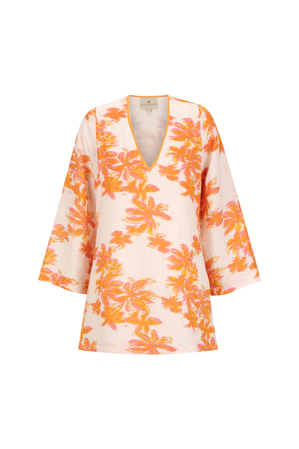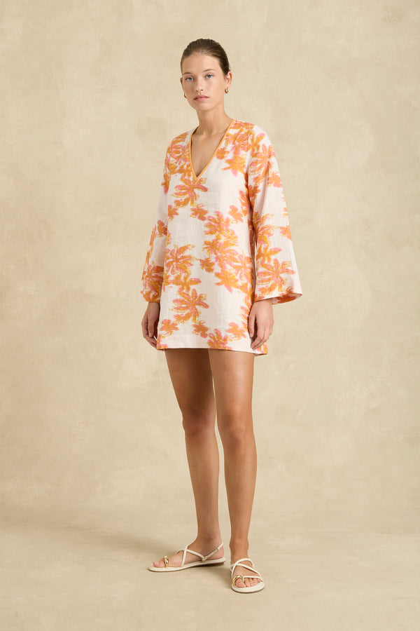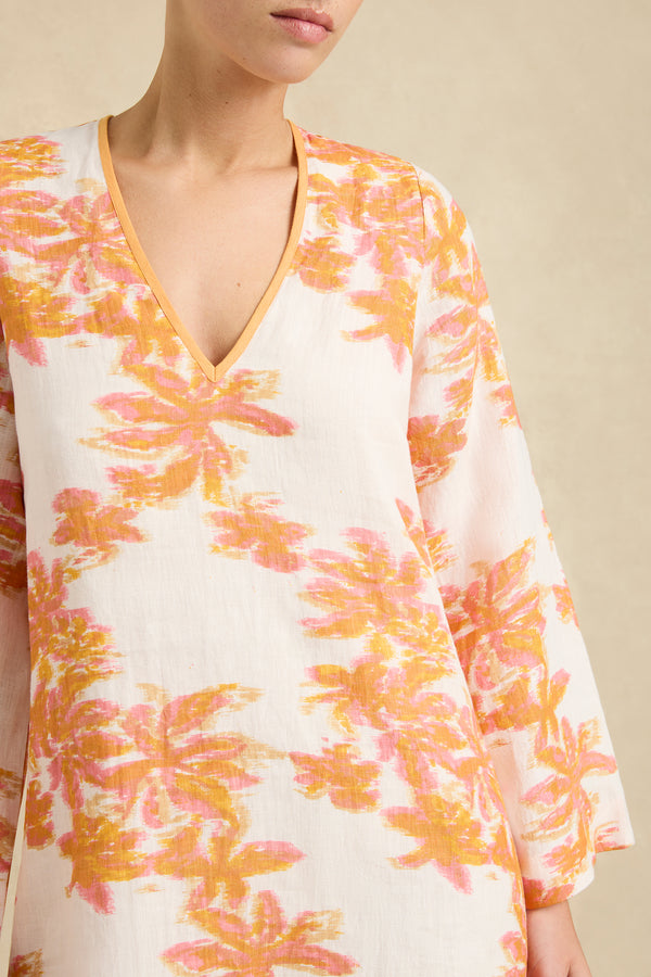 - V neck mini kaftan dress in printed linen.