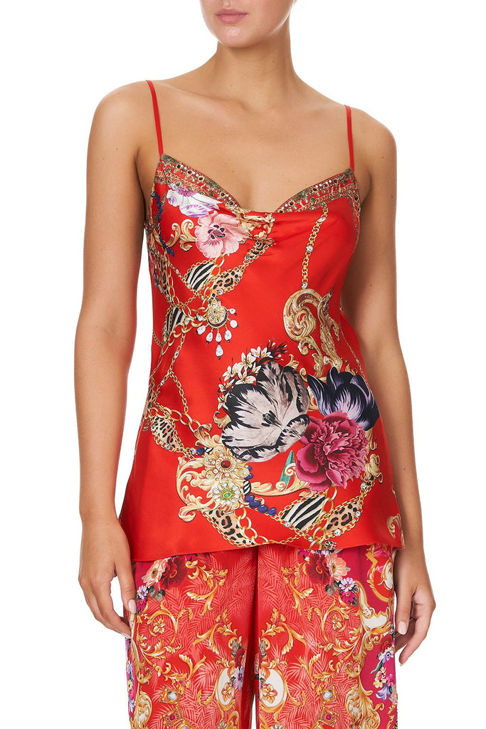 Say au revoir to subtlety this party season with our Prima Donna Bias Cami. A classic silhouette, this blouse draws inspiration from the opulence and excess of the naughty nineties. Sporting a rich crimson red, gold chain details, zebra stripes and purple botanicals blend together effortlessly. This luxury silk camisole plays host to a crystalised cowl neck, a relaxed bodice that leads into a softly flared hemline and customisable rouleau straps. Add extravagance by pairing back with the matching Maxi Wrap Skirt.
