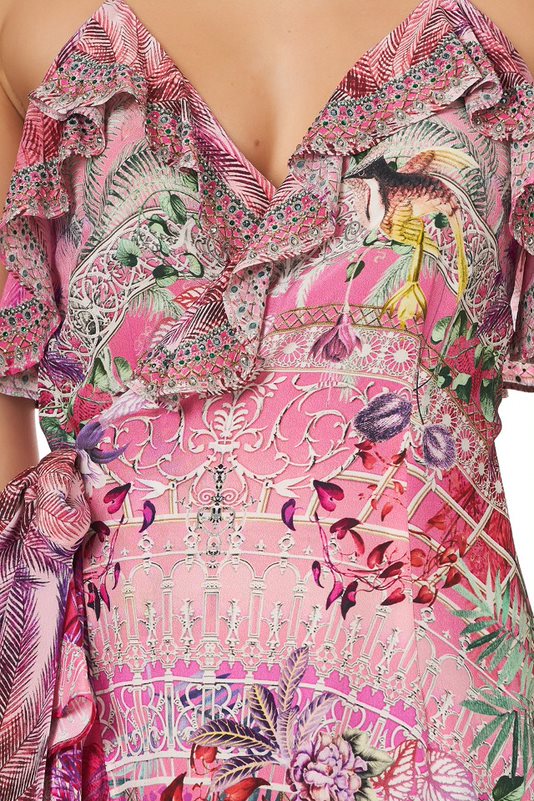 ***WHOLESALE EXCLUSIVE*** The Glasshouse Romance Long Wrap Dress With Frill takes the whimsy of sunlit tearooms as its inspiration. Soft ruffles and luxury silk are enveloped in crystals, white window trims, tropical cascades and lush shades of bubblegum pink. This wrap silhouette features a high-low hem, frills that make their way from neckline to ankle and classic rouleau straps. |