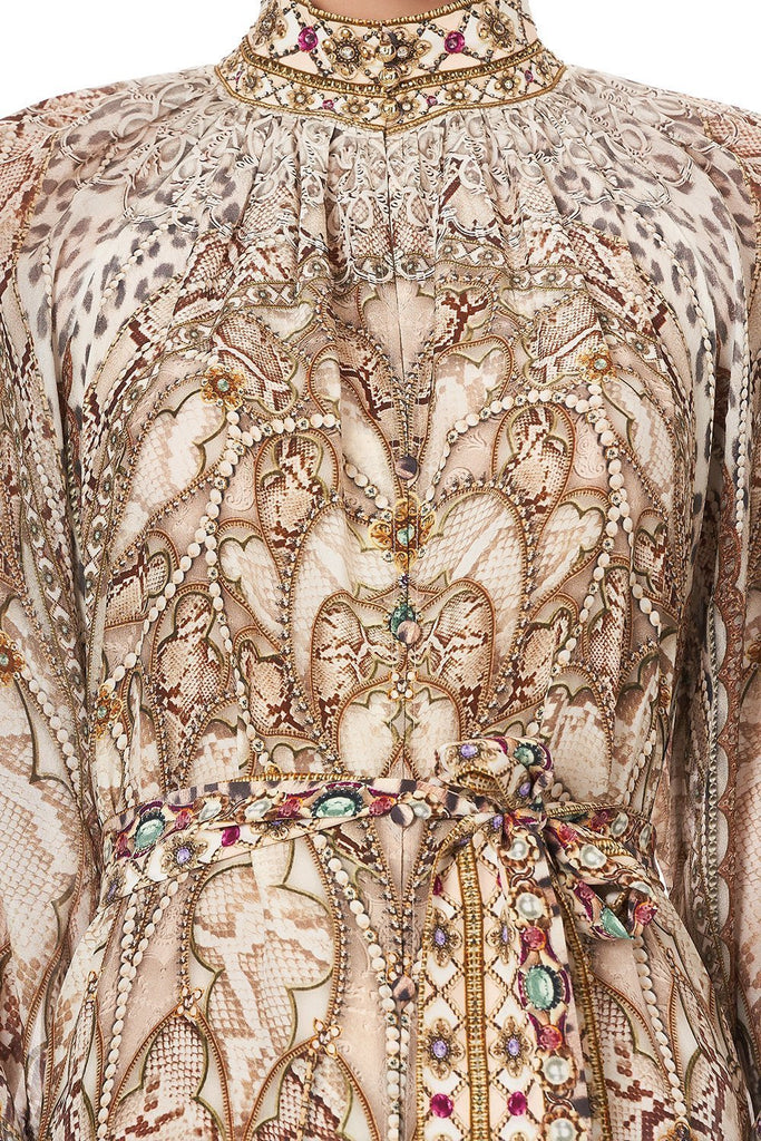 Inspired by Art Nouveau, the All Is Nouveau Raglan Sleeve Midi Shirt Dress is filled with a creamy gold animal textile on which drip colourful jewels and soft florals. An elegant silhouette, with a relaxed fit, this shirt dress is made romantic by a blouson sleeve and mandarin collar. A front button closure can be worn open or closed, enabling this piece to be dressed up for elegant evenings or worn more casually by day. CAMILLA crystals add feminine shine, ensuring femininity no matter how you wear it.