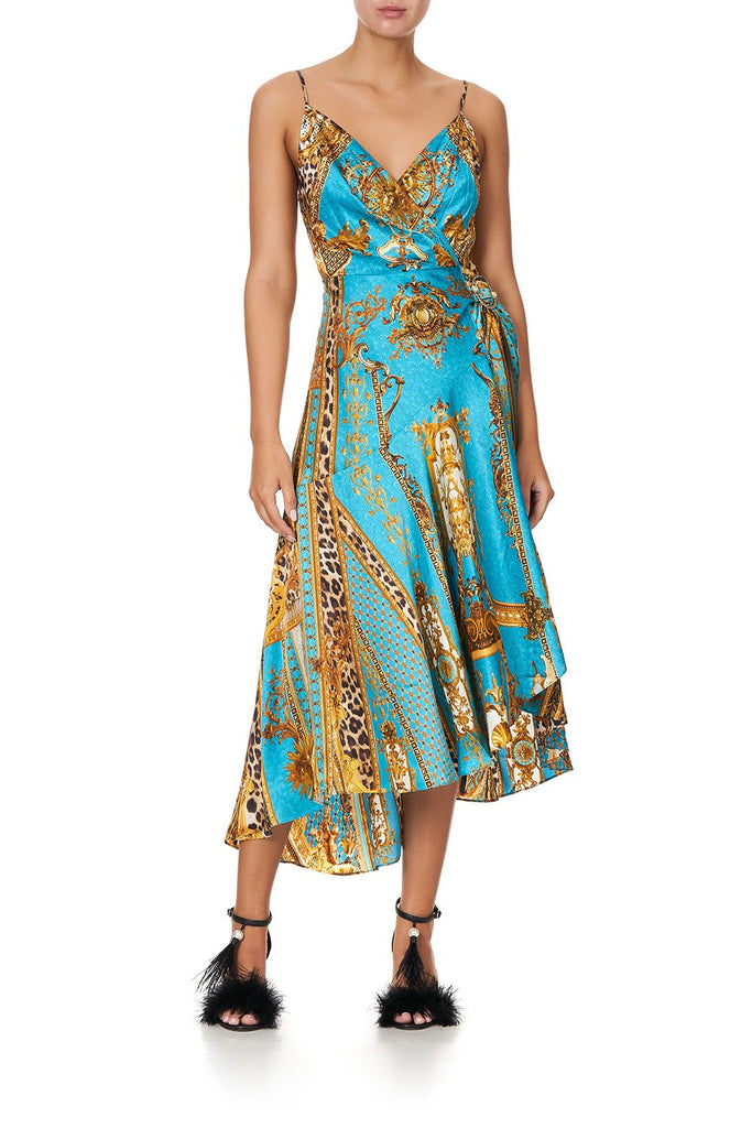 Utterly romantic, the Dripping In Decadence Wrap Dress With Ruffle Hem oozes opulence at every turn. Find yourself enveloped in inspiration that calls to the extravagance of the naughty nineties. Vibrant aquamarine elicits feelings of coastal waters while ornate golden architecture and leopard print speak to all that is lavish and luxurious. This statement dress features a wrap style that cinches the waist and shapes the bust, draping at the buckle which leads into an asymmetric hemline and customisable rouleau straps that melt into crystal embellishment. Accessorise with your favourite gold jewellery to tie it all together.