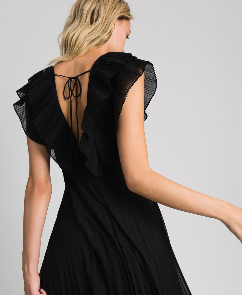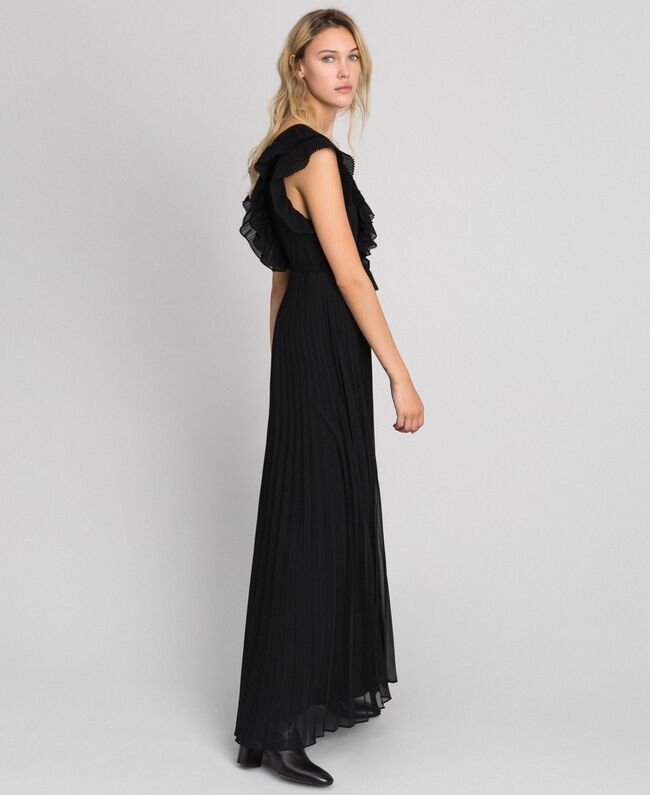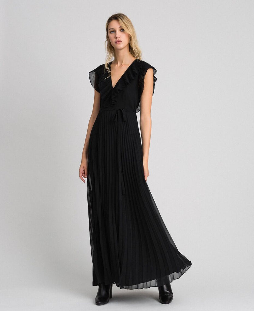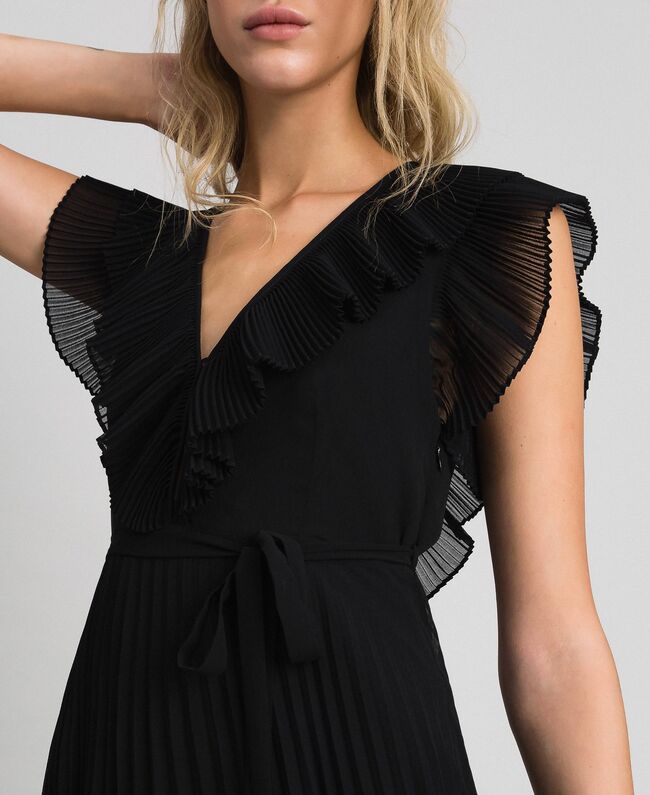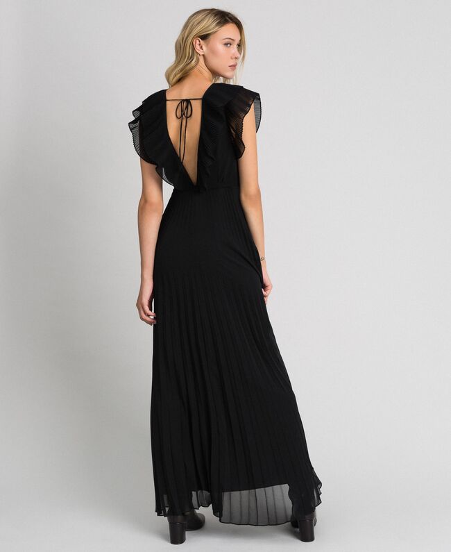Pleated georgette long dress featuring V neckline, matching thin belt, rear laces and side concealed zip fastening.