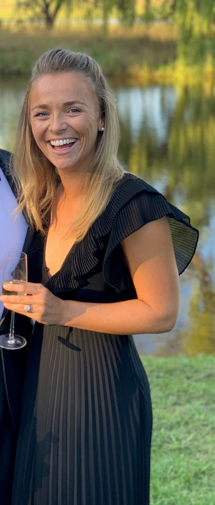 Suggestions by CINT: So much love for this dress. It is timeless dress that is a real treat to wear. Just enough of a v-neck to be elegant, the fluttering pleated sleeve with the bodice fitted then falling into a full maxi pleated skirt. The back also has a v that is bra friendly.