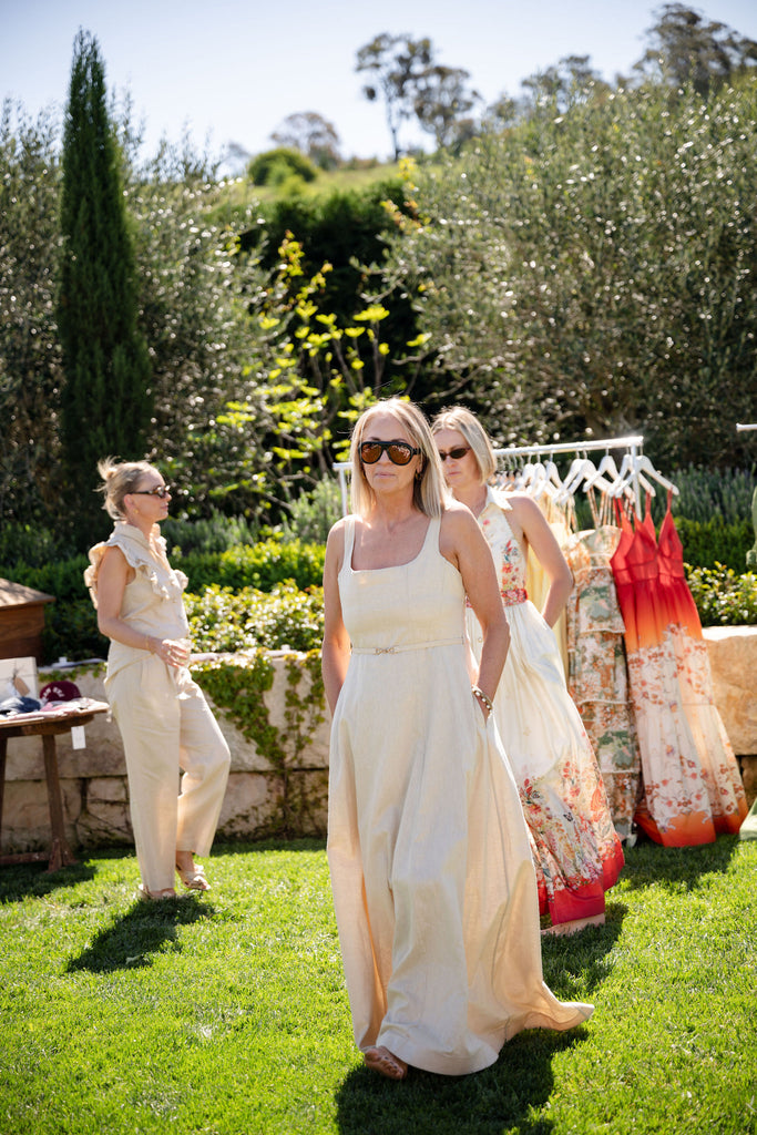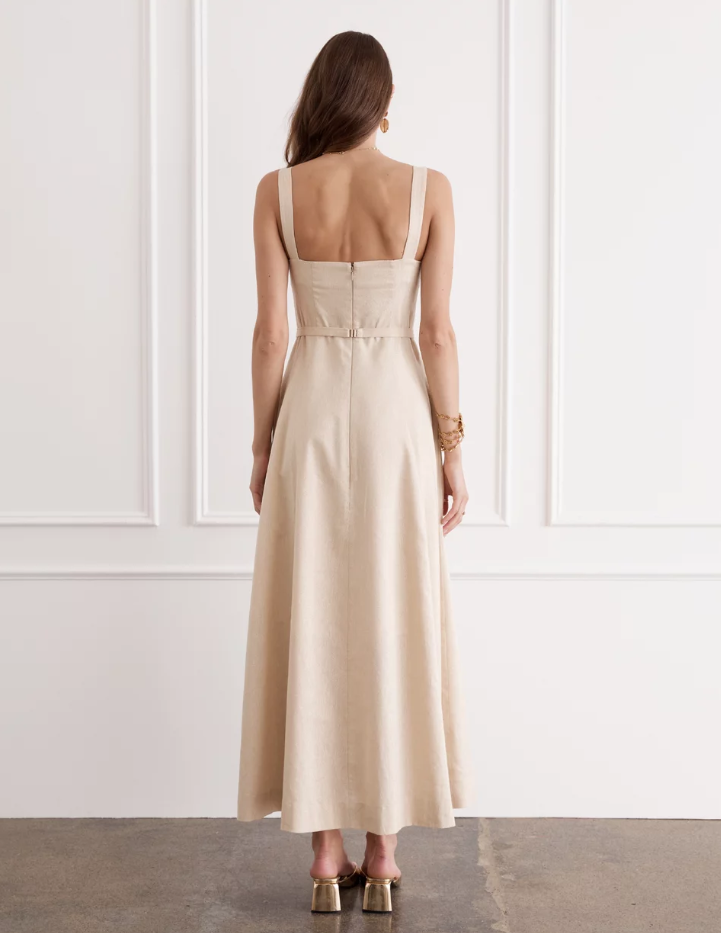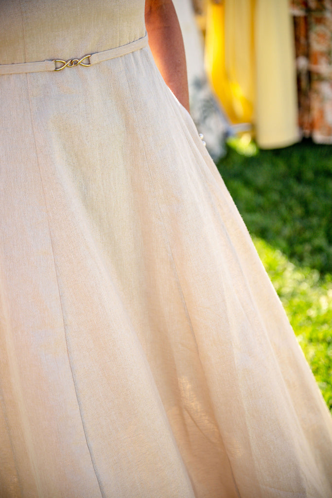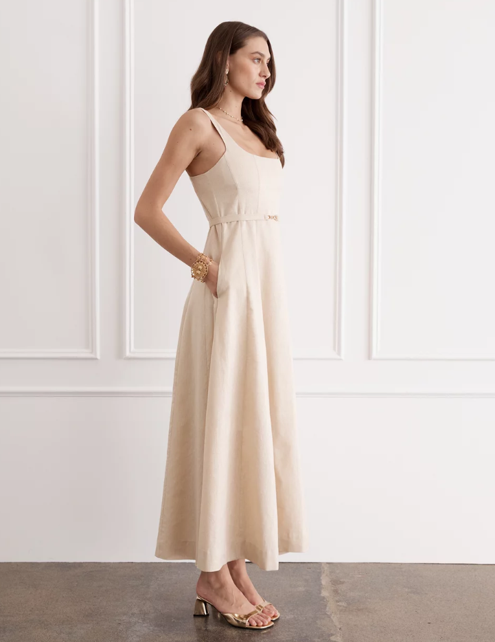 The Claudette Maxi Dress blends sophistication with bold grandeur. Woven from the strength of French Flax Linen and the fluidity of gold metallic thread that captures light with every movement. A structured waistline meets a cascading skirt, whispering echoes of romance and feminine allure.