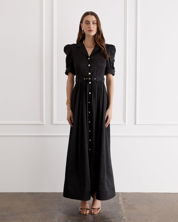 The Eloise Dress embodies a modern twist on a classic silhouette. Woven from French Flax Linen and the decadent fluidity of Mulberry Silk, allowing it to hold both structure and softness. A bold cascading skirt is met with the delicate detailing of custom luminescent pearl buttons - combining both function and flare.