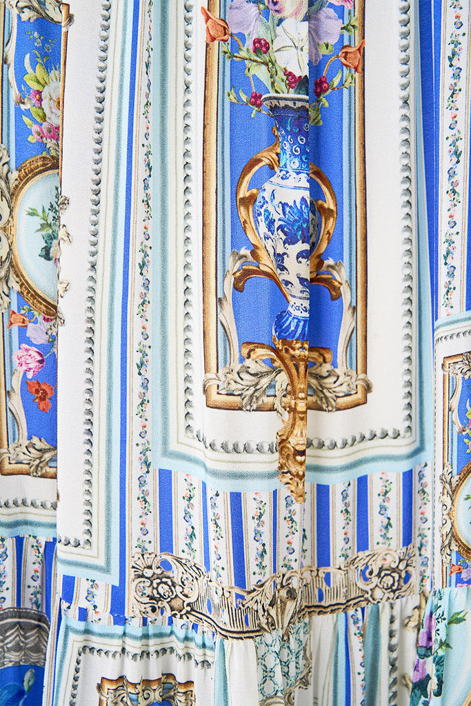 The Ottoman Opulence Long Tiered Dress With Bow Ties is a handcrafted silhouette designed by our in house artisans. Reimagined in an exclusive limited edition print, this tiered maxi dress features a reversible front and back style for effortless versatility. It's adorned with delicate lace trim accents and soft gathering throughout the tiered skirt. It's finished with side ties that are ornamented with beads and crochet motifs for opulent detail.