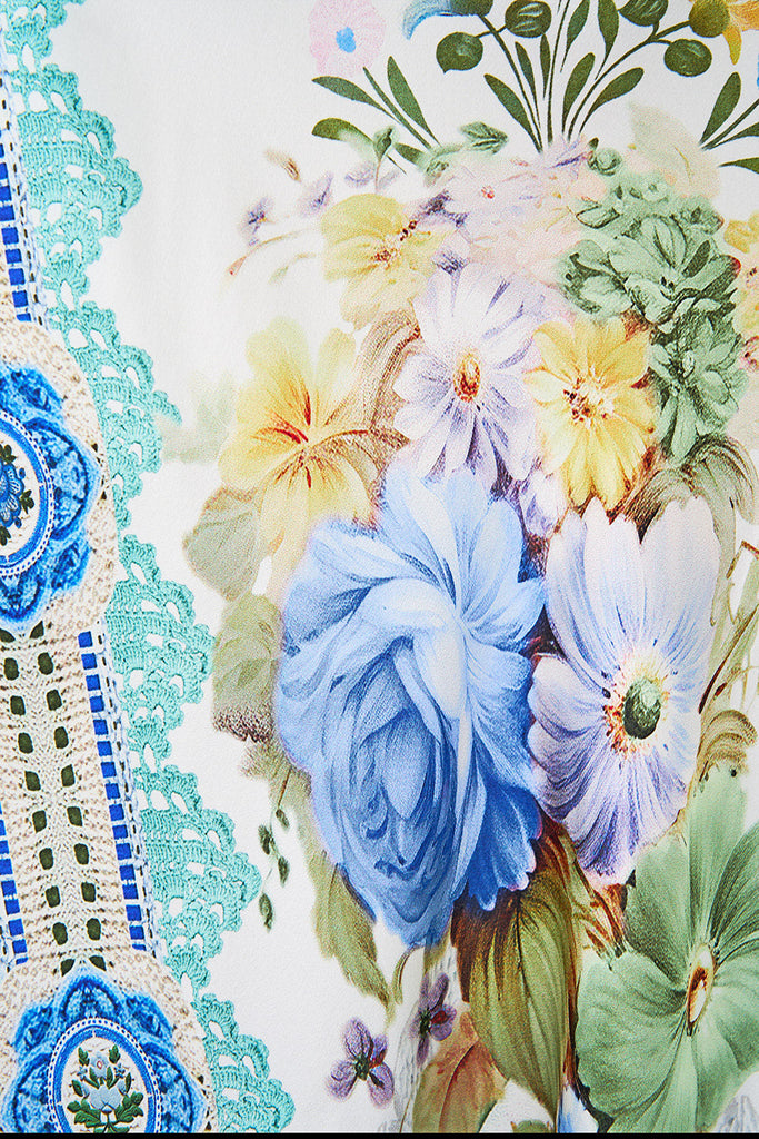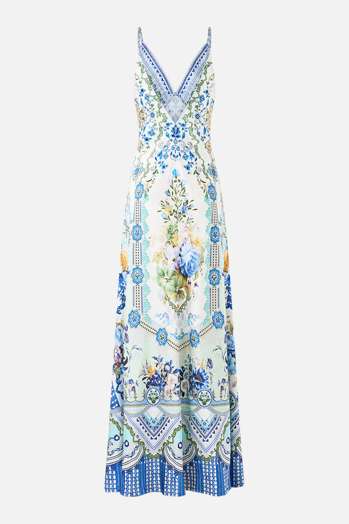 The My Homespun Heart V Neck Full Length Bias Slip Dress is a handcrafted silk silhouette designed by our in house artisans. Reimagined in an exclusive limited edition print, our maxi slip dress is adorned with a shaped panel bustline that falls into a bias cut that skims the bodice and gently cascades into a floor length hemline. Its adjustable straps and lowered back neckline offer a sleek silhouette with effortless allure and its finished with intricately placed crystal embellishment for luminous detail.