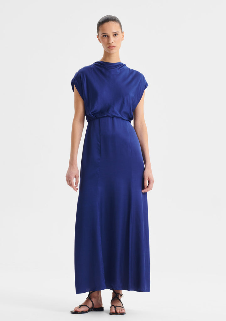 The Fredrika Dress showcases soft structure and elegant detail in a silk blend satin. Featuring a high neck and keyhole tie opening, it’s defined by gathering from one shoulder and waist tucks that create a flattering drape. A slight swing midi hem completes this timeless, feminine silhouette.