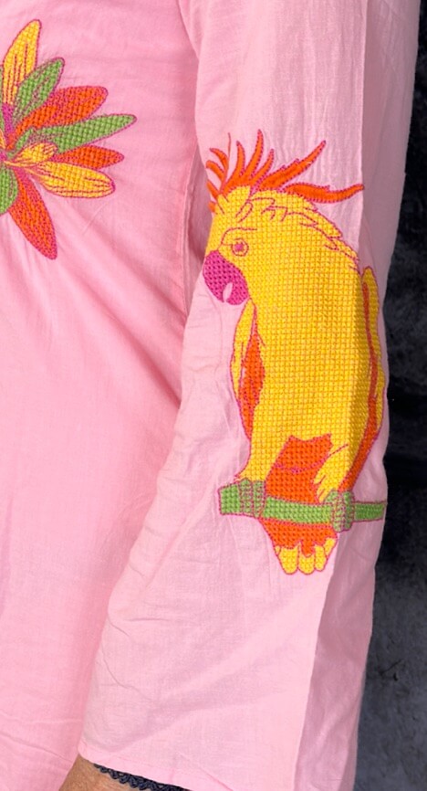 - Embroidered lotus flower and a cheeky cockatoo on the sleeve