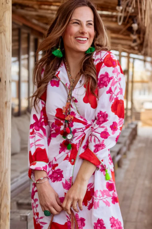 Bring sunshine-ready style to your wardrobe with the Pink Flower Dress. Crafted from lightweight, breathable cotton, this long sun dress features long sleeves with cuffs, a button-down front, and bead detailing on the collar for a subtle touch of elegance. The vibrant all-over floral print makes it perfect for special summer occasions or everyday sunny adventures.
