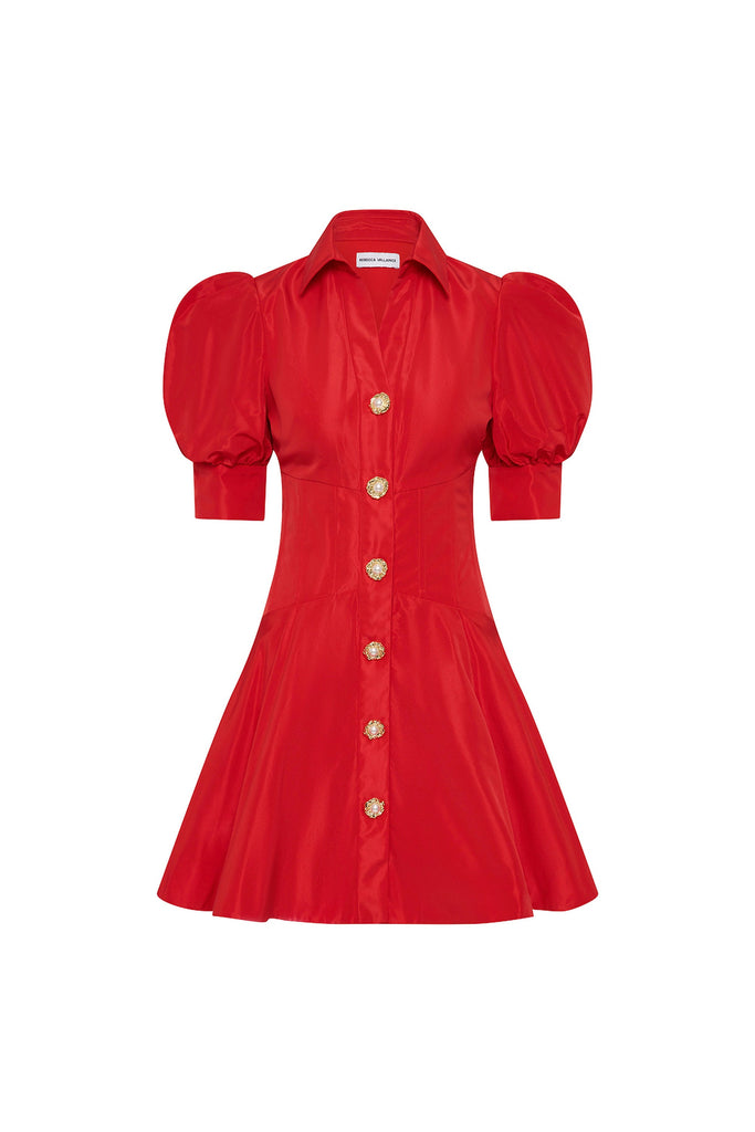 The Jolene Mini Dress in red epitomises chic elegance, tailored from taffeta. Featuring a shirt dress silhouette, its sleek stand collar and short puff sleeves with wide cuffs sculpt a sophisticated shape. The circular mini skirt is enhanced with a cinched waist to flatter the figure, while an invisible zip fastening at the back ensures a seamless fit. Adorned with gold button details for a touch of opulence, this dress is a lovely choice for your next special event.