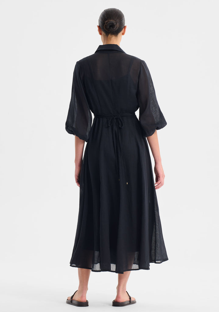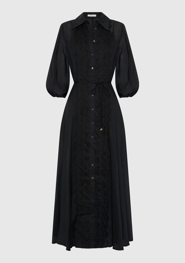 The Constance Shirt Dress is designed in a lightweight ramie blend with a flowing midi silhouette. An elongated collar and button-through front meet soft billow sleeves and elastic cuffs, finished with scallop detailing and a waist tie for definition.