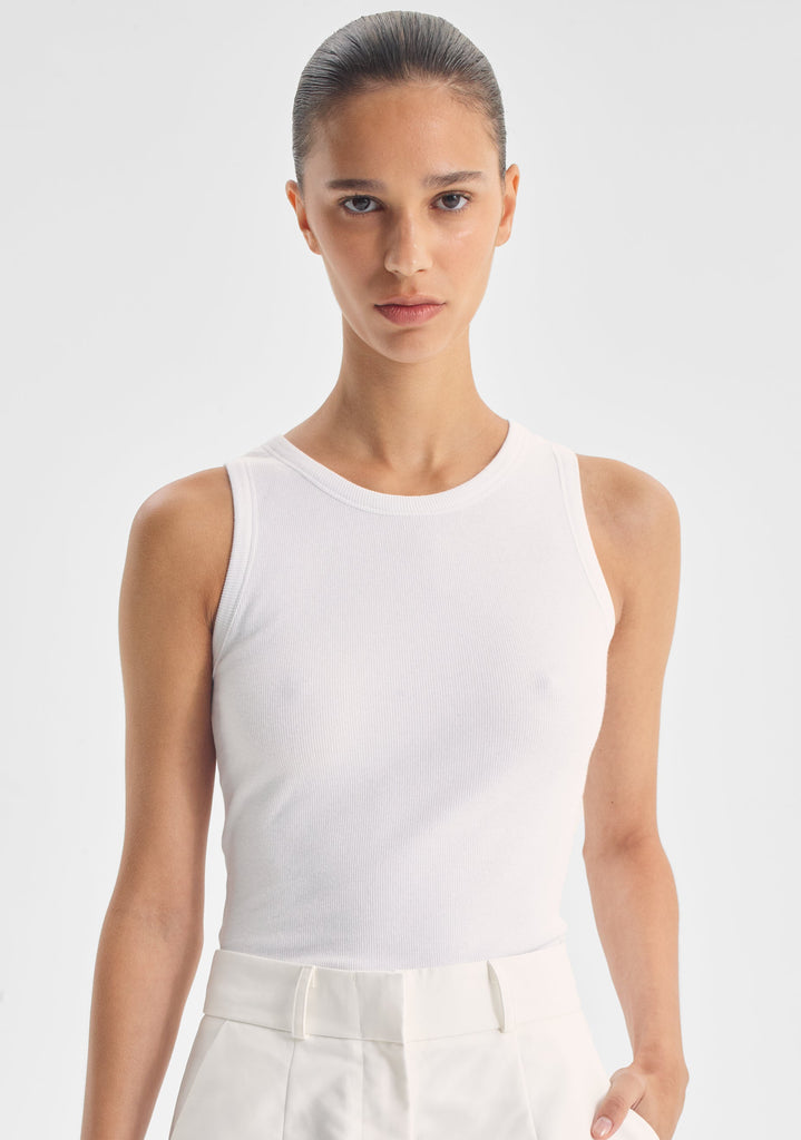 Crafted from soft cotton rib jersey, the Shiloh Tank features a sleek crew racer neckline and a fitted silhouette. Finished with neckline and armhole binding and a clean straight hem, it’s the perfect minimalist layering piece.