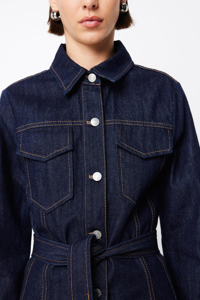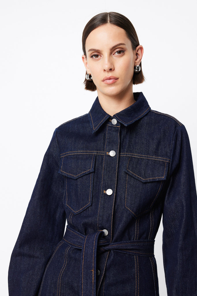 Timeless yet contemporary, the Bexley Mini Dress in indigo wash blends denim’s enduring appeal with modern tailoring. Featuring a collared neckline, button-through front, and long sleeves, this piece is complete with functional pockets and princess seams for a refined fit. Wear it casually or dress it up for a polished look.
