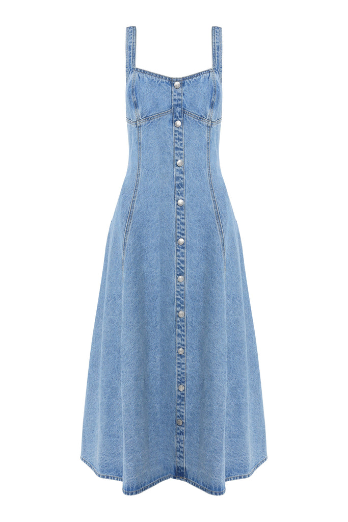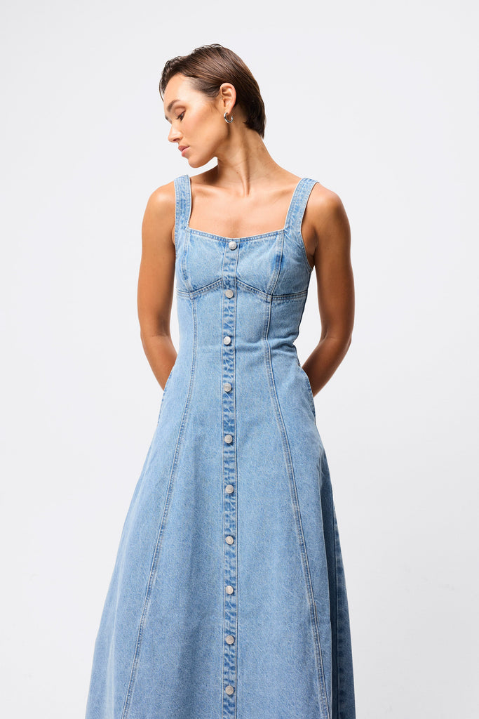 Timeless yet contemporary, the In A Daze Midi Dress in Vintage Blue reimagines classic denim through the lens of modern tailoring. Crafted in a vintage wash, this fit-and-flare silhouette features a structured square neckline, thick straps, and button detailing through the front. Designed to flatter, it’s fitted through the torso with princess seams, underbust darts, and a centre-back zip closure, falling into an A-line skirt with functional front pockets. Whether styled casually or elevated with heels and delicate jewellery for date night, this versatile piece moves effortlessly from weekend to evening.