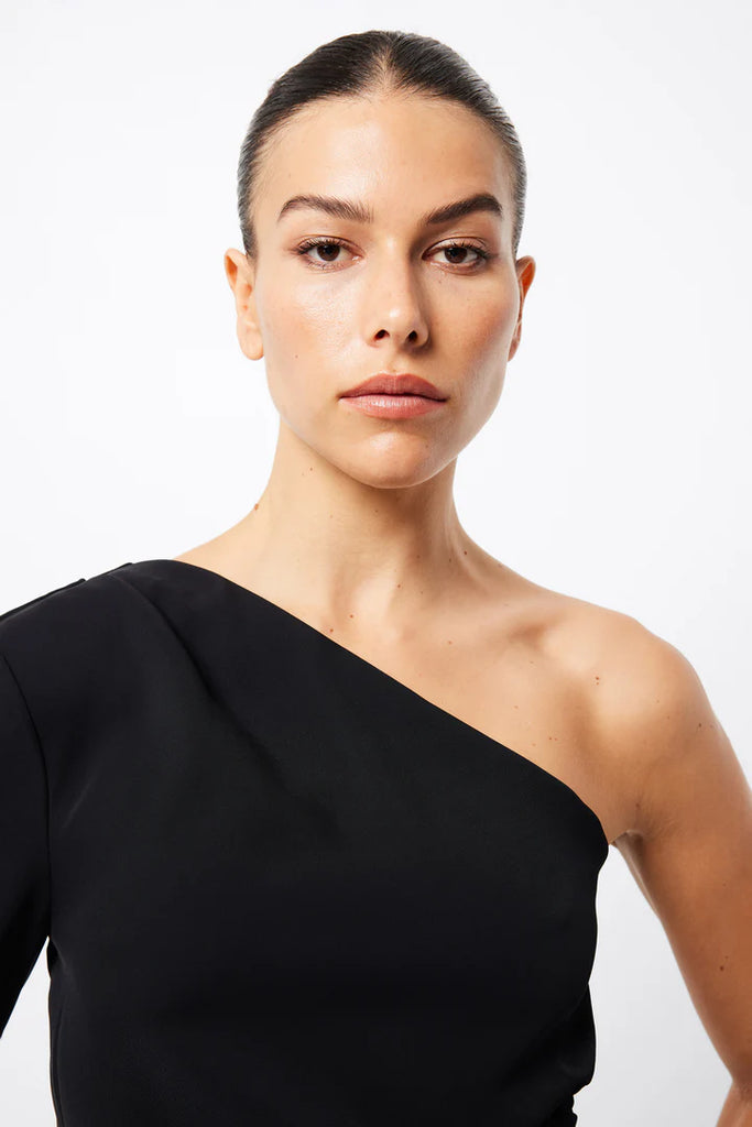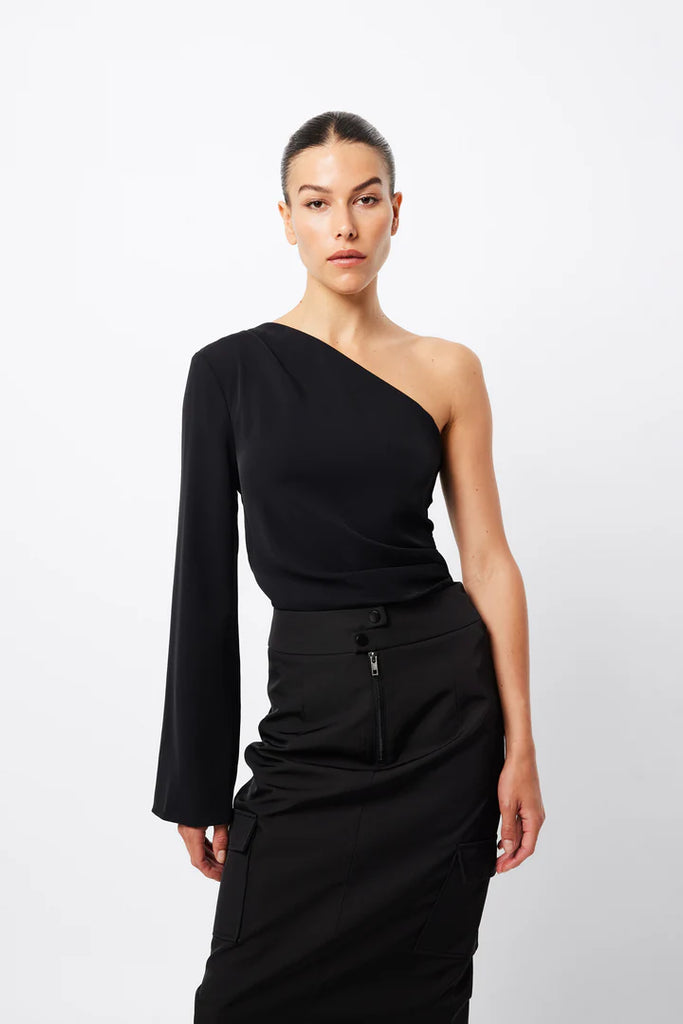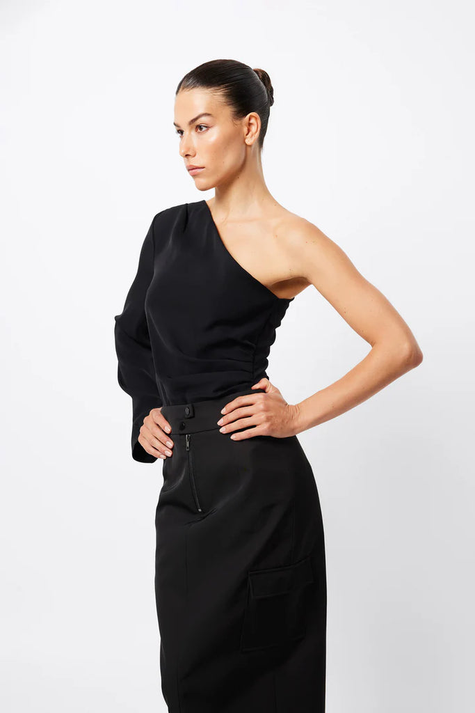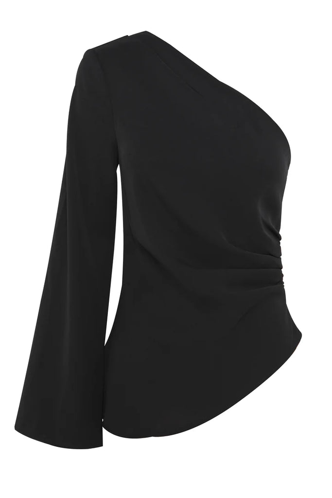 The Novel Top in Black has a striking one shoulder design with flattering side ruching. It's the perfect choice for adding a touch of sophistication to any outfit. Pair this with tailored pants to take you from boardroom to bar, or dress down with denims for drinks with girlfriends