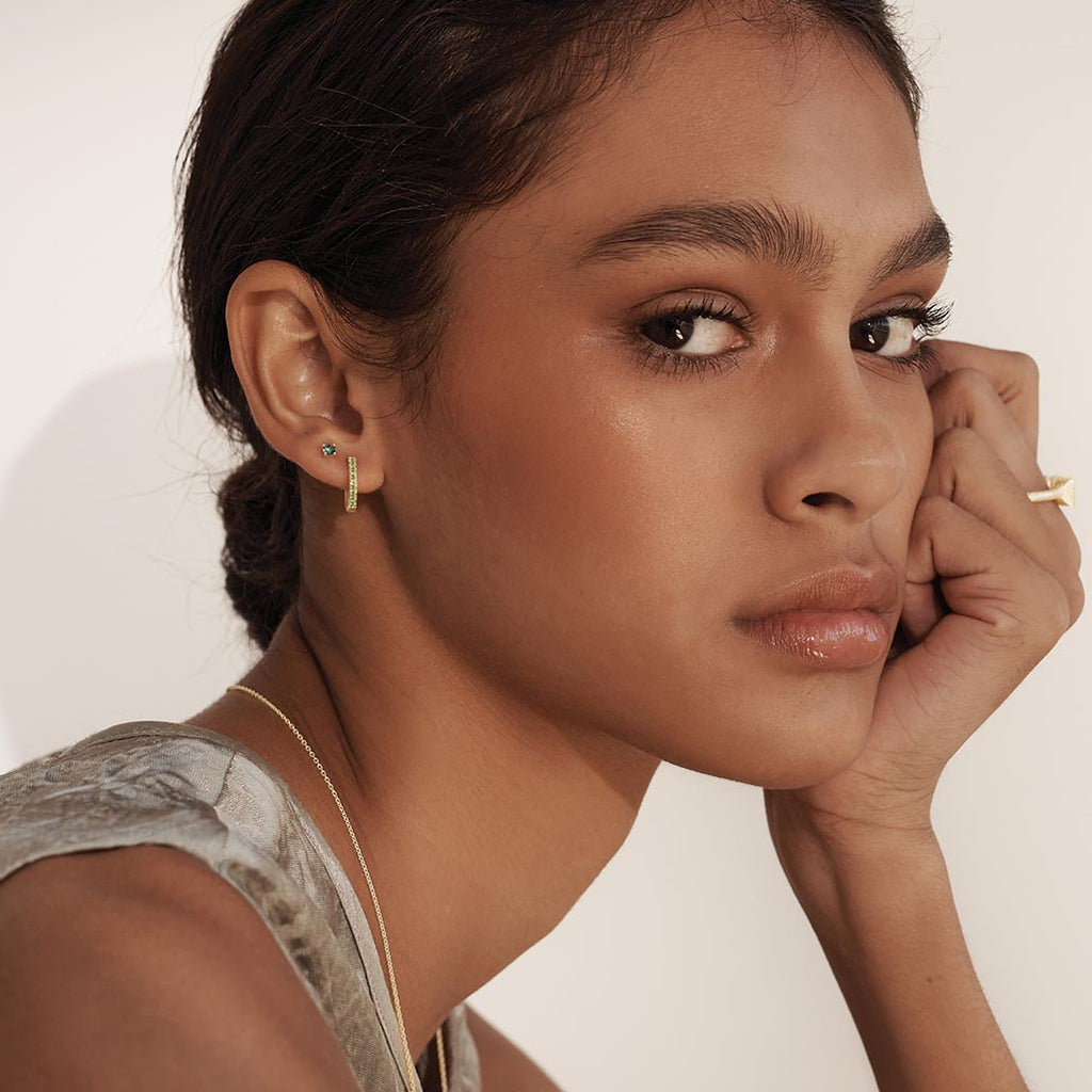 Luxe ear layering featuring Pink Rhodolite and Green Quartz.