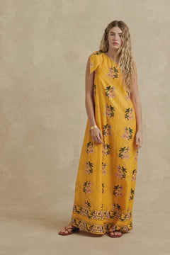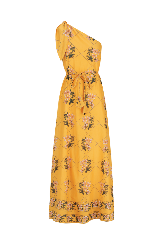 The Helena Dress in Jasmine Yellow is a one shoulder silk habotai gown, hand printed with a cascading floral tile motif in rose and green. Designed with a softly structured bust and a flowing trapeze silhouette, it falls elegantly to the floor. A tie detail at the shoulder allows for adjustability, adding a sense of ease to the striking sun soaked shape.
