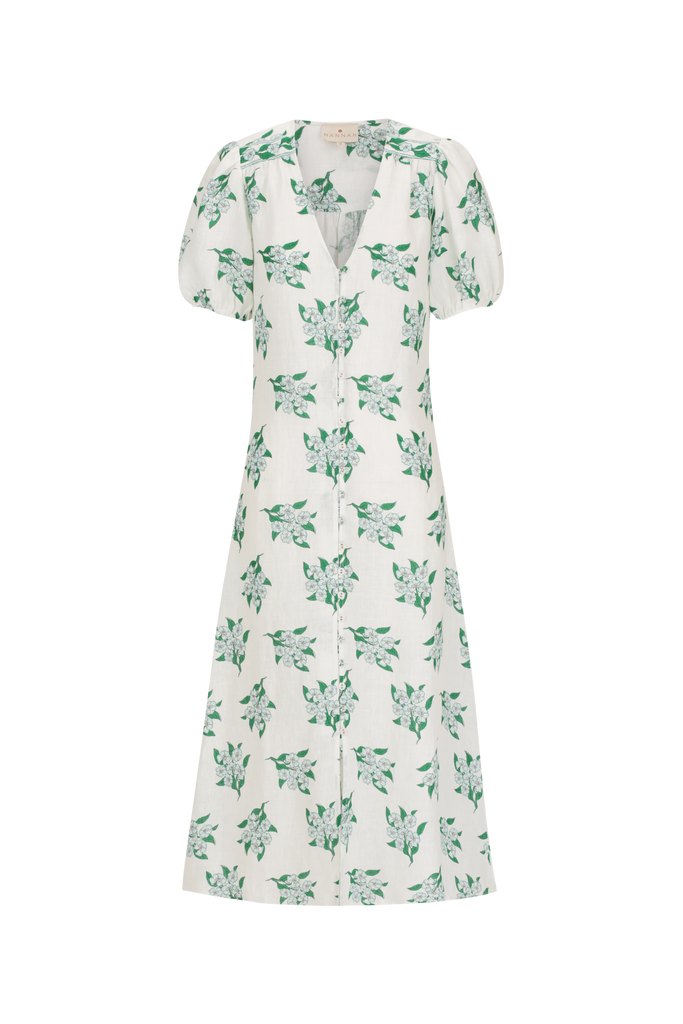With its soft puff sleeves and flattering v-neckline, the Poppy Dress brings a fresh elegance to everyday dressing. Crafted from breathable linen and hand screen printed in a scattered floral of emerald green and ivory, the silhouette falls to a mid-length hem with a gentle flare. A timeless choice for picnics, long lunches and weekend escapes.