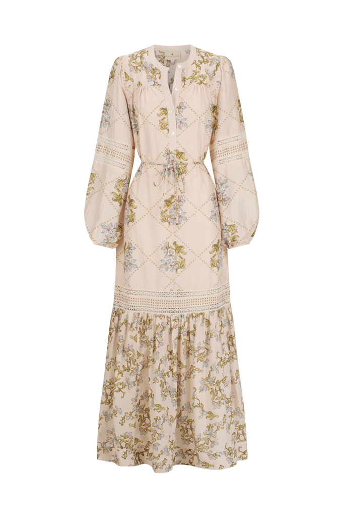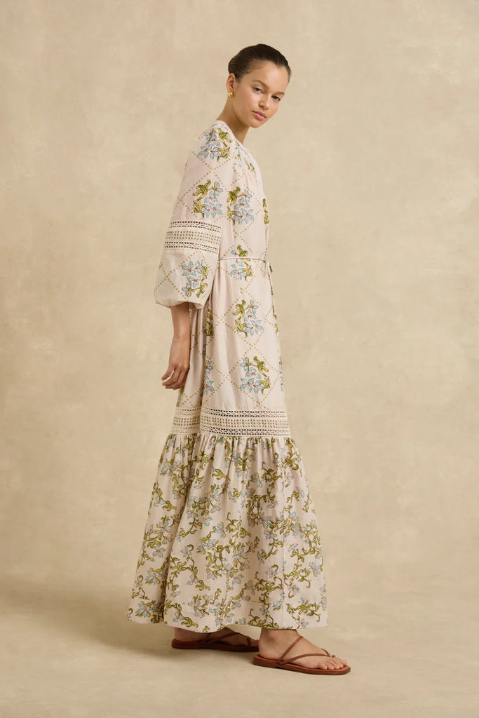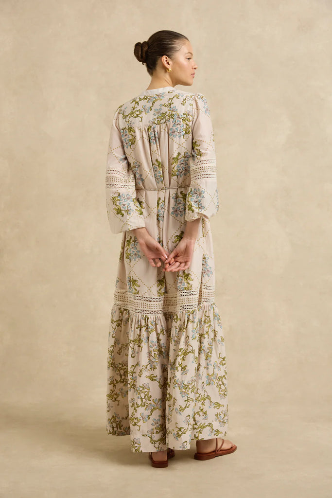 Subtle yet full of story, the Viviana Dress in Jasmine Nude features our hand-painted jasmine motif framed in a soft trellis of olive green and cornflower blue. Set against a natural base, the palette feels quiet and refined. Designed in a silk cotton blend for breathability and softness, the silhouette is detailed with ladder lace inserts, a gathered tiered hem, and an adjustable drawstring waist — making this an easy, everyday statement.