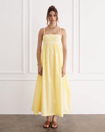 Crafted from 100% crisp Cotton Poplin, the Polly Maxi Dress in Limoné is the embodiment of summer romance. The cascading maxi skirt flows with effortless grace, with delicate self-tying shoulder straps that add a touch of feminine allure. A lace detail at the waistband is a nod to vintage softness. Created for gathering around a table with loved ones and twirling away into balmy summer evenings.