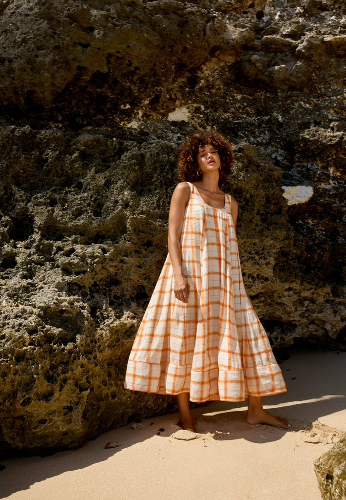 The Le Soleil Sundress in Mandarine Gingham features a hand painted, watercolour gingham artwork, digitally printed and crafted in 68% linen 32% silk. This style features a scoop centre front and back neckline. The Le Soleil Sundress is designed to be maxi in length, increasing in volume from neckline to hem, intentionally weighted at the hem to float and bounce with movement.