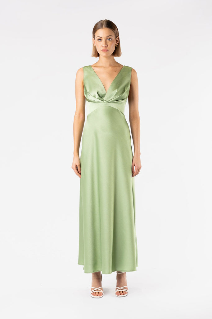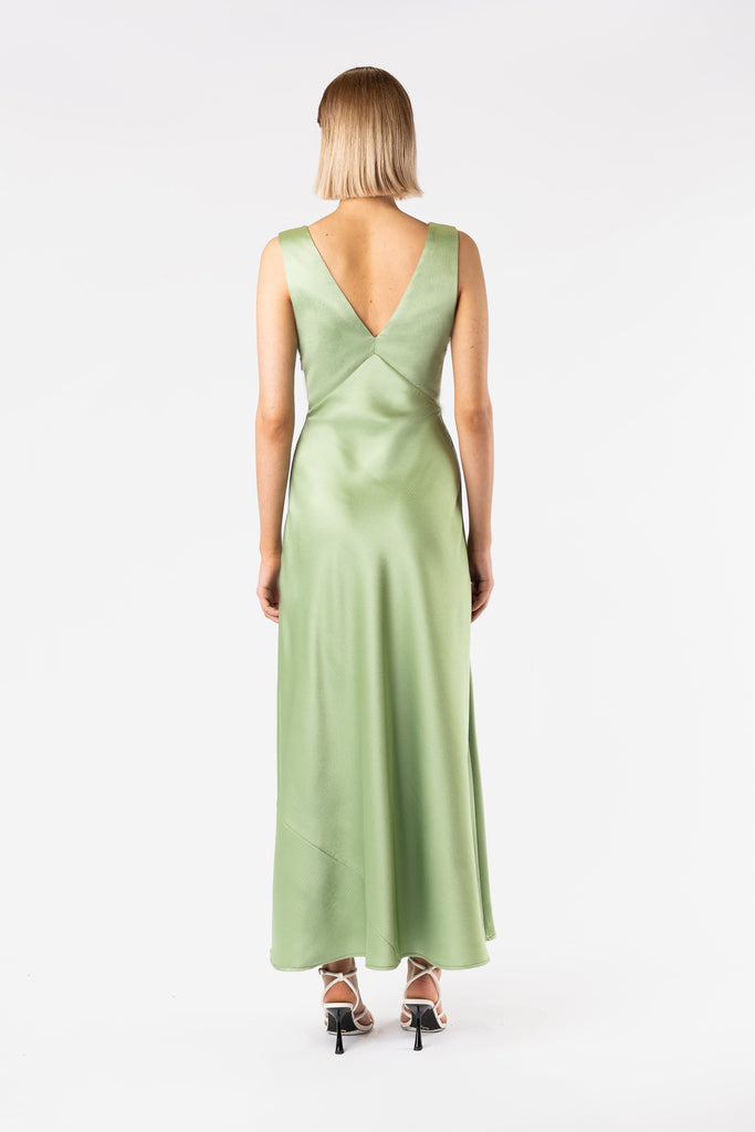 The Clara Dress in Akira. Designed with timeless intention, this exquisite slip is tailored from luxurious stretch satin with a brushed finish, ensuring a soft and lustrous feel against the skin. The dress features an alluring V-neckline, complemented by delicate gathered sculpting at the bust. The Clara embodies timeless elegance and is a must-have for every wardrobe.