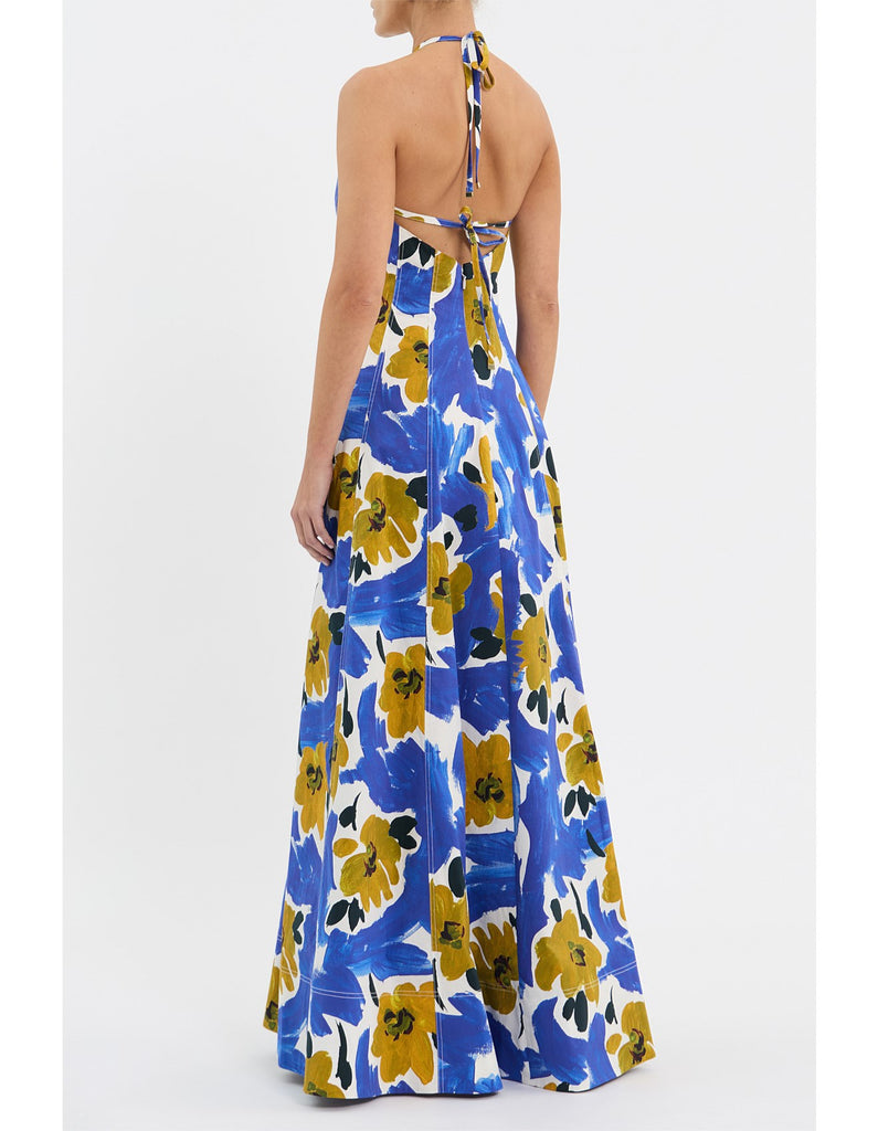 The Rebecca Vallance Sabina Maxi is a sophisticated dress featuring a striking blue, mustard, and black-and-white floral print.