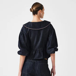 A lightweight denim wrap blouse - effortlessly chic with a playful twist. Featuring a flattering wrap silhouette and feminine peplum hem. The statement oversized collar is finished with soft blush pink embroidery for a subtle pop of contrast.